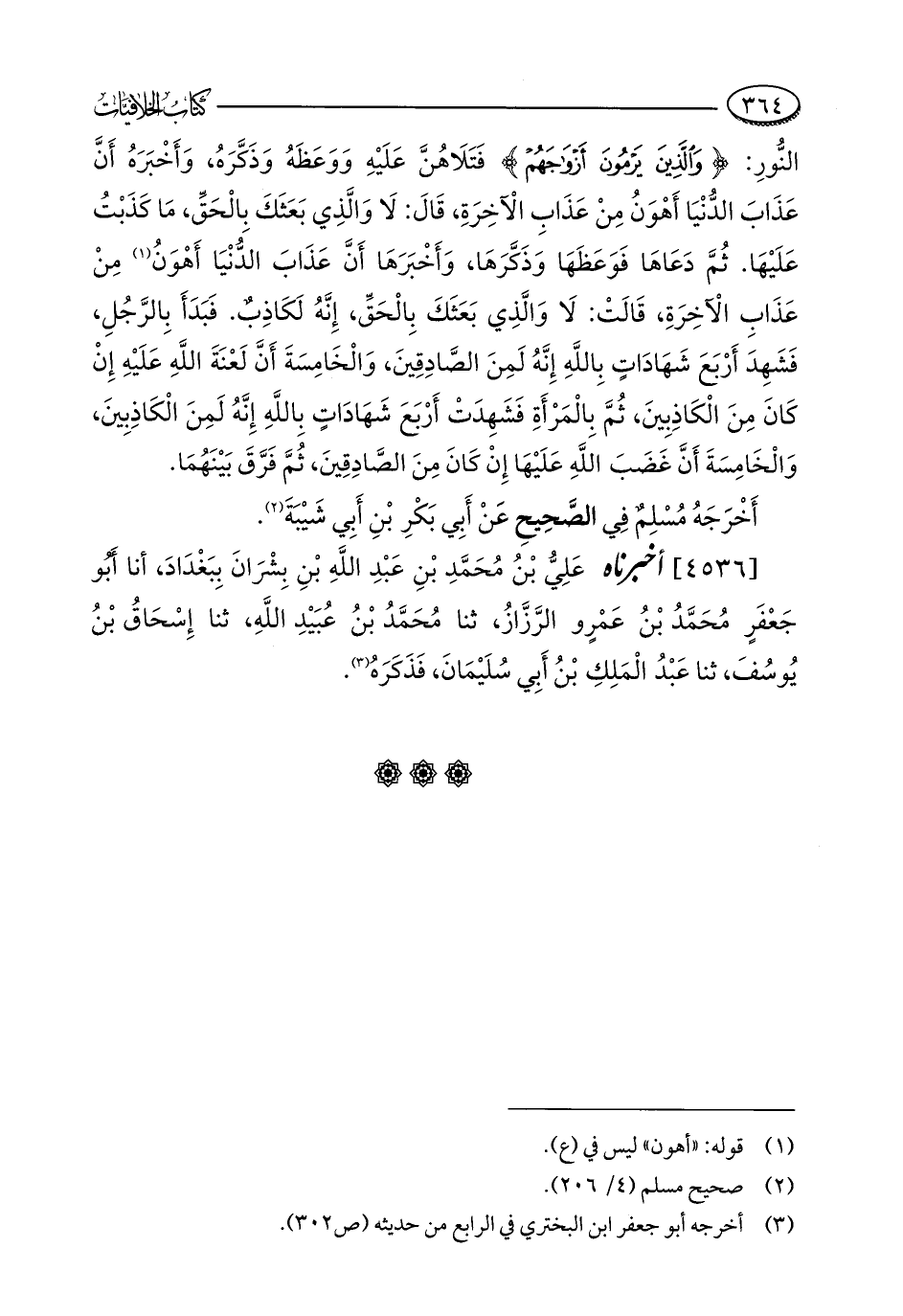 النُّورِ: {وَالَّذِينَ يَرْمُونَ أَزْوَاجَهُمْ} فَتَلَاهُنَّ عَلَيْهِ وَوَعَظَهُ وَذَكَّرَهُ، وَأَخْبَرَهُ أَنَّ عَذَابَ الدُّنْيَا أَهْوَنُ مِنْ عَذَابِ الْآخِرَةِ، قَالَ: لَا وَالَّذِي بَعَثَكَ بِالْحَقِّ، مَا كَذَبْتُ عَلَيْهَا. ثُمَّ دَعَاهَا فَوَعَظَهَا وَذَكَّرَهَا، وَأَخْبَرَهَا أَنَّ عَذَابَ الدُّنْيَا أَهْوَنُ (¬1) مِنْ عَذَابِ الْآخِرَةِ، قَالَتْ: لَا وَالَّذِي بَعَثَكَ بِالْحَقِّ، إِنَّهُ لَكَاذِبٌ. فَبَدَأَ بِالرَّجُلِ، فَشَهِدَ أَرْبَعَ شَهَادَاتٍ بِاللَّهِ إِنَّهُ لَمِنَ الصَّادِقِينَ، وَالْخَامِسَةَ أَنَّ لَعْنَةَ اللَّهِ عَلَيْهِ إِنْ كَانَ مِنَ الْكَاذِبِينَ، ثُمَّ بِالْمَرْأَةِ فَشَهِدَتْ أَرْبَعَ شَهَادَاتٍ بِاللَّهِ إِنَّهُ لَمِنَ الْكَاذِبِينَ، وَالْخَامِسَةَ أَنَّ غَضَبَ اللَّهِ عَلَيْهَا إِنْ كَانَ مِنَ الصَّادِقِينَ، ثُمَّ فَرَّقَ بَيْنَهُمَا.