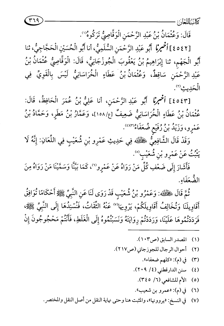 [4543] أخبرنا أَبُو عَبْدِ الرَّحْمَنِ، أنا عَلِيُّ بْنُ عُمَرَ الْحَافِظُ، قَالَ: عُثْمَانُ بْنُ عَطَاءٍ الْخُرَاسَانِيُّ ضَعِيفٌ، وَعَمَّارُ بْنُ مَطَرٍ، وَحَمَّادُ بْنُ عَمْرٍو، وَزَيْدُ بْنُ رُفَيْعٍ ضُعَفَاءُ (¬3) (¬4).
