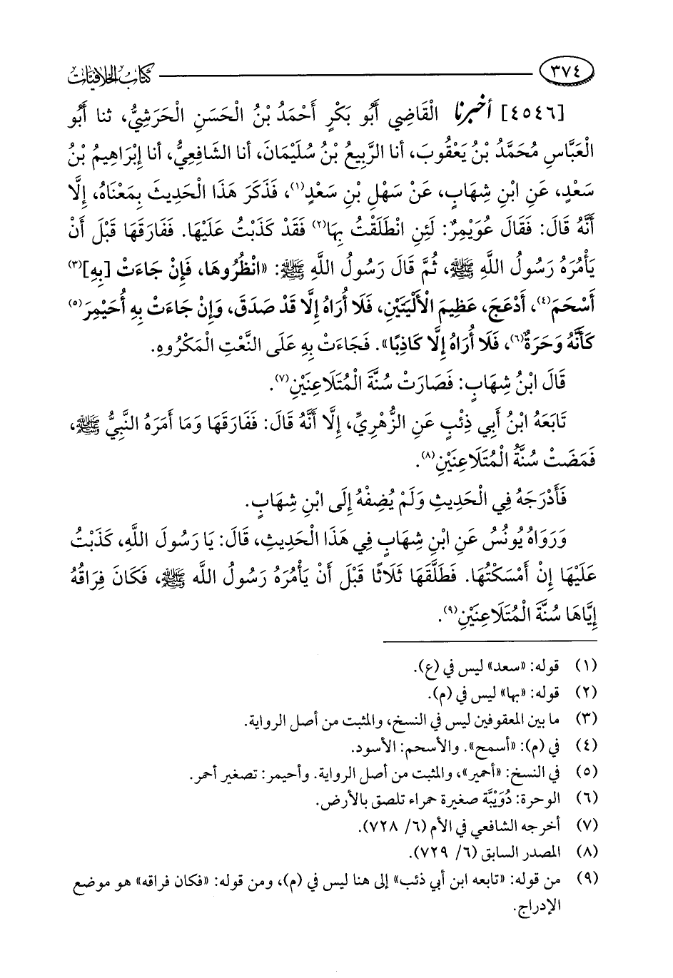 [4546] أخبرنا الْقَاضِي أَبُو بَكْرٍ أَحْمَدُ بْنُ الْحَسَنِ الْحَرَشِيُّ، ثنا أَبُو الْعَبَّاسِ مُحَمَّدُ بْنُ يَعْقُوبَ، أنا الرَّبِيعُ بْنُ سُلَيْمَانَ، أنا الشَافِعِيُّ، أنا إِبْرَاهِيمُ بْنُ سَعْدٍ، عَنِ ابْنِ شِهَاب، عَنْ سَهْلِ بْنِ سَعْدٍ (¬1)، فَذَكَرَ هَذَا الْحَدِيثَ بِمَعْنَاهُ، إِلَّا أَنَّهُ قَالَ: فَقَالَ عُوَيْمِرٌ: لَئِنِ انْطَلَقْتُ بِهَا (¬2) فَقَدْ كَذَبْتُ عَلَيْهَا. فَفَارَقَهَا قَبْلَ أَنْ يَأْمُرَهُ رَسُولُ اللَّهِ - صلى الله عليه وسلم -، ثُمَّ قَالَ رَسُولُ اللَّهِ - صلى الله عليه وسلم -: "انْظُرُوهَا، فَإِنْ جَاءَتْ [بِهِ] (¬3) أَسْحَمَ (¬4)، أَدْعَجَ، عَظِيمَ الْأَلْيَتَيْنِ، فَلَا أُرَاهُ إِلَّا قَدْ صَدَقَ، وَإِنْ جَاءَتْ بِهِ أُحَيْمِرَ (¬5) كَأَنَّهُ وَحَرَةٌ (¬6)، فَلَا أُرَاهُ إِلَّا كَاذِبًا". فَجَاءَتْ بِهِ عَلَى النَّعْتِ الْمَكْرُوهِ.