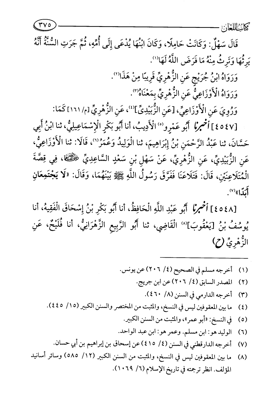 [4547] أخبرنا أَبُو عَمْرٍو (¬5) الْأَدِيبُ، أنا أَبُو بَكْرٍ الْإِسْمَاعِيلِيُّ، ثنا ابْنُ أَبِي حَسَّانَ، ثنا عَبْدُ الرَّحْمَنِ بْنُ إِبْرَاهِيمَ، ثنا الْوَلِيدُ وَعُمَرُ (¬6)، قَالَا: ثنا الْأَوْزَاعِيُّ، عَنِ الزُّبَيْدِيِّ، عَنِ الزُّهْرِيِّ، عَنْ سَهْلِ بْنِ سَعْدٍ السَّاعِدِيِّ - رضي الله عنهما -، فِي قِصَّةَ الْمُتَلَاعِنَيْنِ، قَالَ: فَتَلَاعَنَا فَفَرَّقَ رَسُولُ اللَّهِ - صلى الله عليه وسلم - بَيْنَهُمَا، وَقَالَ: "لَا يَجْتَمِعَانِ أَبَدًا" (¬7).