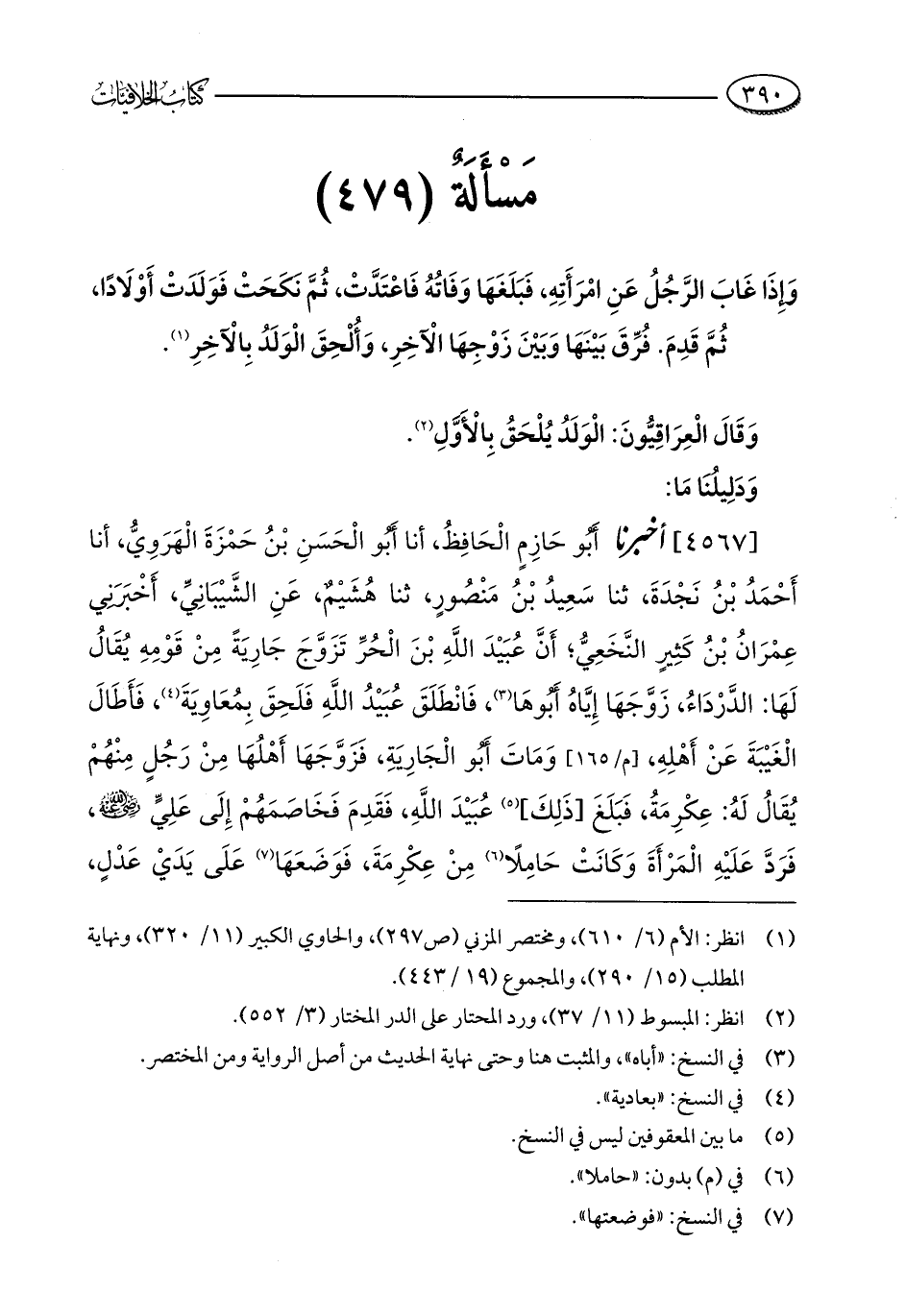 مَسْأَلَةٌ (479): وَإِذَا غَابَ الرَّجُلُ عَنِ امْرَأَتِهِ، فَبَلَغَهَا وَفَاتُهُ فَاعْتَدَّتْ، ثُمَّ نَكَحَتْ فَوَلَدَتْ أَوْلَادًا، ثُمَّ قَدِمَ. فُرِّقَ بَيْنَهَا وَبَيْنَ زَوْجِهَا الْآخِرِ، وَأُلْحِقَ الْوَلَدُ بِالْآخِرِ (¬1).