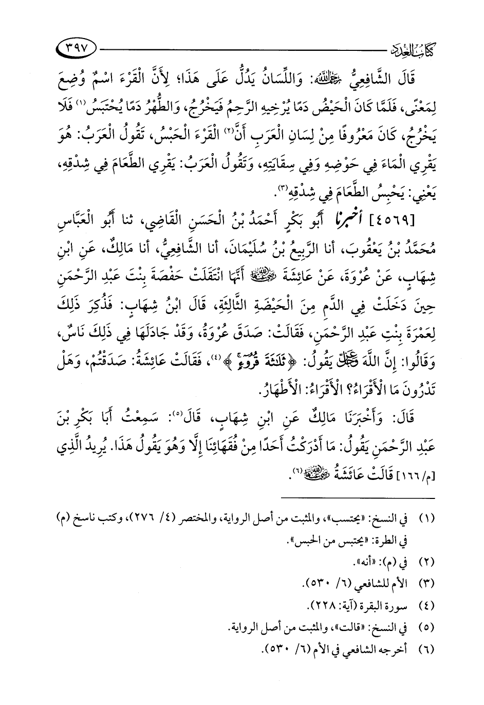 [4569] أخبرنا أبُو بَكْرٍ أَحْمَدُ بْنُ الْحَسَنِ الْقَاضِي، ثنا أَبُو الْعَبَّاسِ مُحَمَّدُ بْنُ يَعْقُوبَ، أنا الرَّبِيعُ بْنُ سُلَيْمَانَ، أنا الشَّافِعِيُّ، أنا مَالِكٌ، عَنِ ابْنِ شِهَابٍ، عَنْ عُرْوَةَ، عَنْ عَائِشَةَ - رضي الله عنها - أَنَّهَا انْتَقَلَتْ حَفْصَةَ بِنْتَ عَبْدِ الرَّحْمَنِ حِينَ دَخَلَتْ فِي الدَّمِ مِنَ الْحَيْضَةِ الثَّالِثَةِ، قَالَ ابْنُ شِهَابٍ: فَذُكِرَ ذَلِكَ لِعَمْرَةَ بِنْتِ عَبْدِ الرَّحْمَنِ، فَقَالَتْ: صَدَقَ عُرْوَةُ، وَقَدْ جَادَلَهَا فِي ذَلِكَ نَاسٌ، وَقَالُوا: إِنَّ اللَّهَ - عز وجل - يَقُولُ: {ثَلَاثَةَ قُرُوءٍ} (¬4)، فَقَالَتْ عَائِشَةُ: صَدَقْتُمْ، وَهَلْ تَدْرُونَ مَا الْأَقْرَاءُ؟ الْأَقْرَاءُ: الْأَطْهَارُ.
