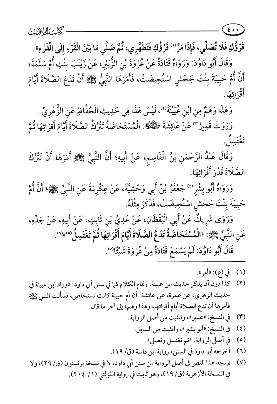 (¬2) كذا دون أن يذكر حديث ابن عيينة، وتمام الكلام كما في سنن أبي داود: "وزاد ابن عيينة في حديث الزهري، عن عمرة، عن عائشة: أن أم حبيبة كانت تستحاض، فسألت النبي - صلى الله عليه وسلم - فأمرها أن تدع الصلاة أيام أقرائها، وهذا وهم" إلى آخر ما قال.