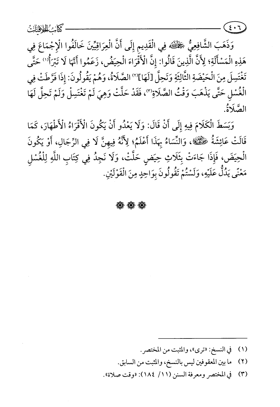 وَذَهَبَ الشَّافِعِيُّ - رحمه الله - فِي الْقَدِيمِ إِلَى أَنَّ الْعِرَاقِيِّينَ خَالَفُوا الْإِجْمَاعَ فِي هَذِهِ الْمَسْأَلَةِ؛ لِأَنَّ الَّذِينَ قَالُوا: إِنَّ الْأَقْرَاءَ الْحِيَضُ، زَعَمُوا أَنَّهَا لَا تَبْرَأُ (¬1) حَتَّى تَغْتَسِلَ مِنَ الْحَيْضَةِ الثَّالِثَةِ وَتَحِلَّ [لَهَا] (¬2) الصَّلَاةُ، وَهُمْ يَقُولُونَ: إِذَا فَرَّطَتْ فِي الْغُسْلِ حَتَّى يَذْهَبَ وَقْتُ الصَّلَاةِ (¬3)، فَقَدْ حَلَّتْ وَهِيَ لَمْ تَغْتَسِلْ وَلَمْ تَحِلَّ لَهَا الصَّلَاةُ.