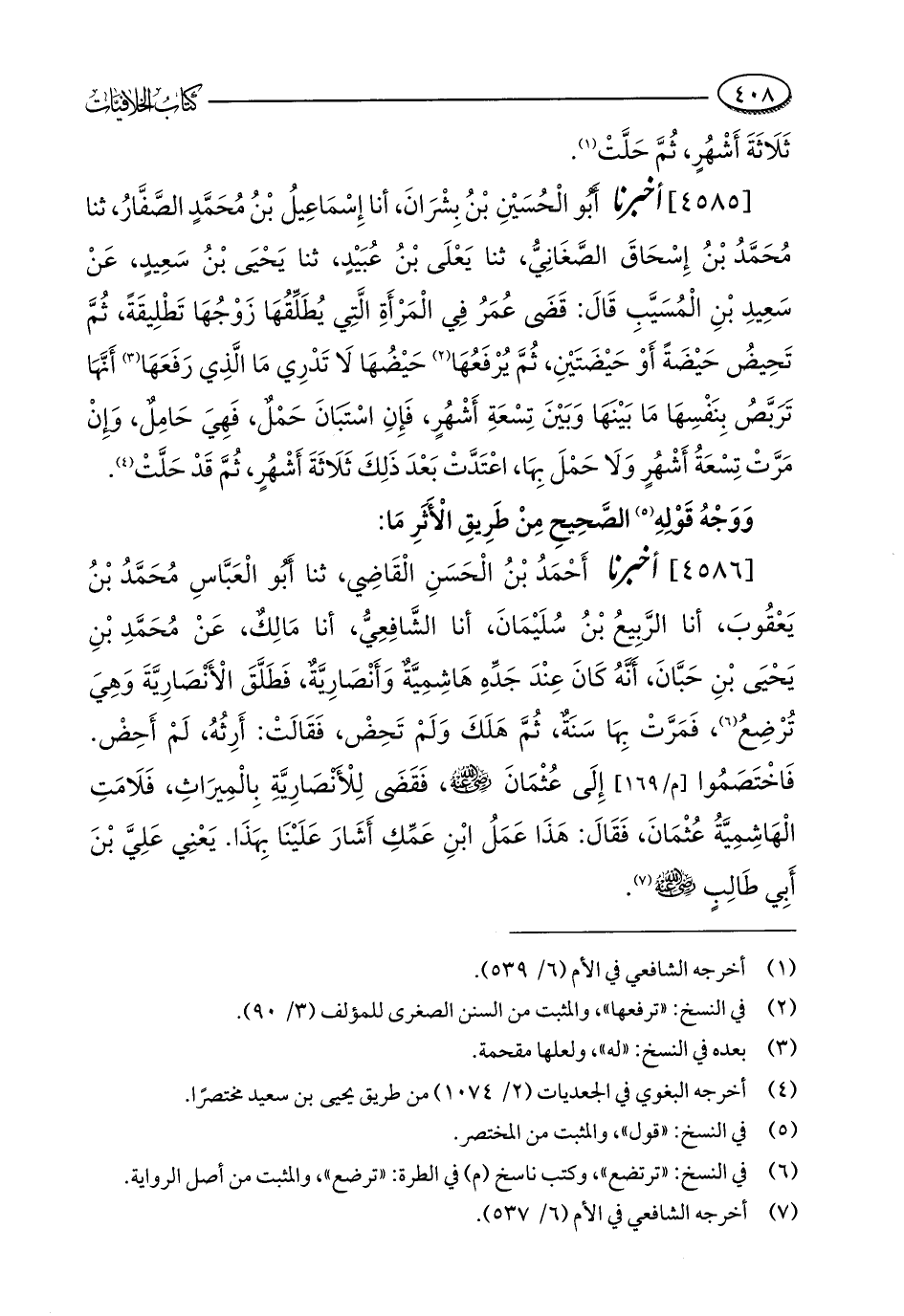 [4586] أخبرنا أَحْمَدُ بْنُ الْحَسَنِ الْقَاضِي، ثنا أَبُو الْعَبَّاسِ مُحَمَّدُ بْنُ يَعْقُوبَ، أنا الرَّبِيعُ بْنُ سُلَيْمَانَ، أنا الشَّافِعِيُّ، أنا مَالِكٌ، عَنْ مُحَمَّدِ بْنِ يَحْيَى بْنِ حَبَّانَ، أَنَّهُ كَانَ عِنْدَ جَدِّهِ هَاشِمِيَّةٌ وَأَنْصَارِيَّةٌ، فَطَلَّقَ الْأَنْصَارِيَّةَ وَهِيَ تُرْضِعُ (¬6)، فَمَرَّتْ بِهَا سَنَةٌ، ثُمَّ هَلَكَ وَلَمْ تَحِضْ، فَقَالَتْ: أَرِثُهُ، لَمْ أَحِضْ. فَاخْتَصَمُوا إِلَى عُثْمَانَ - رضي الله عنه -، فَقَضَى لِلْأَنْصَارِيَّةِ بِالْمِيرَاثِ، فَلَامَتِ الْهَاشِمِيَّةُ عُثْمَانَ، فَقَالَ: هَذَا عَمَلُ ابْنِ عَمِّكِ أَشَارَ عَلَيْنَا بِهَذَا. يَعْنِي عَلِيَّ بْنَ أَبِي طَالِبٍ - رضي الله عنه - (¬7).