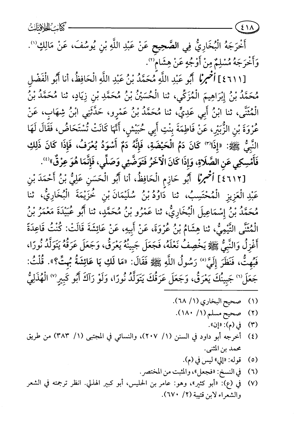 [4612] أخبرنا أَبُو حَازِمٍ الْحَافِظُ، أنا أَبُو الْحَسَنِ عَلِيُّ بْنُ أَحْمَدَ بْنِ عَبْدِ الْعَزِيزِ الْمُحْتَسِبُ، ثنا دَاوُدُ بْنُ سُلَيْمَانَ بْنِ خُزَيْمَةَ الْبُخَارِيُّ، ثنا مُحَمَّدُ بْنُ إِسْمَاعِيلَ الْبُخَارِيُّ، ثنا عَمْرُو بْنُ مُحَمَّدٍ، ثنا أَبُو عُبَيْدَةَ مَعْمَرُ بْنُ الْمُثَنَّى التَّيْمِيُّ، ثنا هِشَامُ بْنُ عُرْوَةَ، عَنْ أَبِيهِ، عَنْ عَائِشَةَ قَالَتْ: كُنْتُ قَاعِدَةً أَغْزِلُ وَالنَّبِيُّ - صلى الله عليه وسلم - يخْصِفُ نَعْلَهُ، فَجَعَلَ جَبِينُهُ يَعْرَقُ، وَجَعَلَ عَرَقُهُ يَتَوَلَّدُ نُورًا، فَبُهِتُّ، فَنَظَرَ إِلَيَّ (¬5) رَسُولُ اللَّهِ - صلى الله عليه وسلم - فَقَالَ: "مَا لَكِ يَا عَائِشَةُ بُهِتِّ؟ ". قُلْتُ: جَعَلَ (¬6) جَبِينُكَ يَعْرَقُ، وَجَعَلَ عَرَقُكَ يَتَوَلَّدُ نُورًا، وَلَوْ رَآكَ أَبُو كَبِيرٍ (¬7) الْهُذَلِيُّ