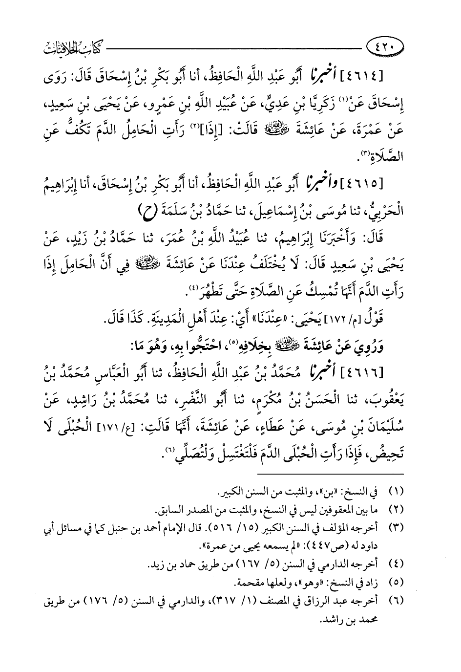 [4614] أخبرنا أَبُو عَبْدِ اللَّهِ الْحَافِظُ، أنا أَبُو بَكْرِ بْنُ إِسْحَاقَ قَالَ: رَوَى إِسْحَاقَ عَنْ (¬1) زَكَرِيَّا بْنِ عَدِيٍّ، عَنْ عُبَيْدِ اللَّهِ بْنِ عَمْرٍو، عَنْ يَحْيَى بْنِ سَعِيدٍ، عَنْ عَمْرَةَ، عَنْ عَائِشَةَ - رضي الله عنها - قَالَتْ: [إِذَا] (¬2) رَأَتِ الْحَامِلُ الدَّمَ تَكُفُّ عَنِ الصَّلَاةِ (¬3).