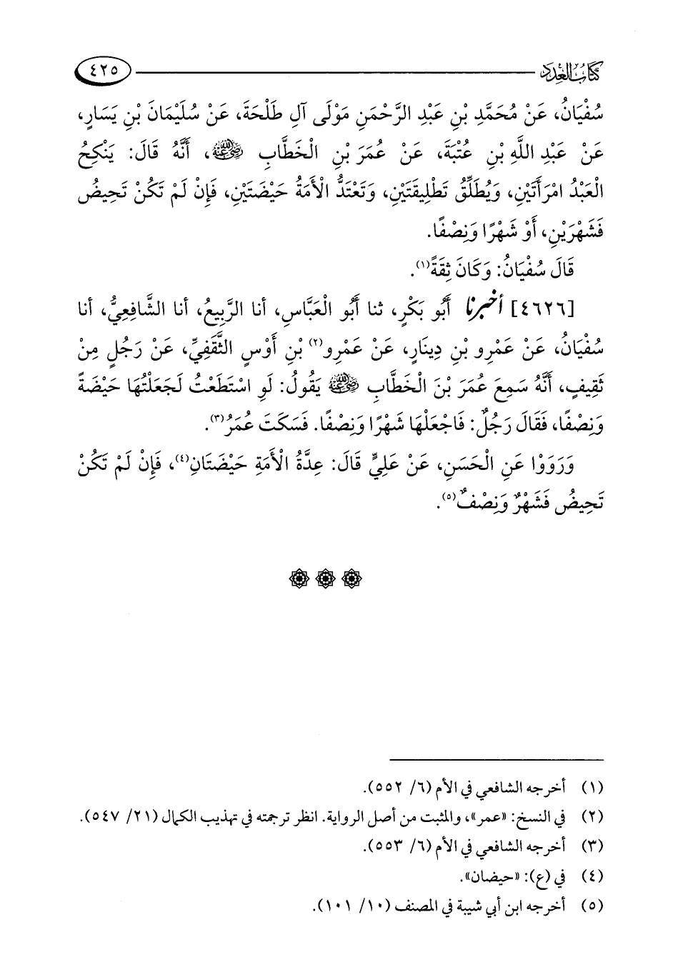 سُفْيَانُ، عَنْ مُحَمَّدِ بْنِ عَبْدِ الرَّحْمَنِ مَوْلَى آلِ طَلْحَةَ، عَنْ سُلَيْمَانَ بْنِ يَسَارٍ، عَنْ عَبْدِ اللَّهِ بْنِ عُتْبَةَ، عَنْ عُمَرَ بْنِ الْخَطَّابِ - رضي الله عنه -، أَنَّهُ قَالَ: يَنْكِحُ الْعَبْدُ امْرَأَتَيْنِ، وَيُطَلِّقُ تَطْلِيقَتَيْنِ، وَتَعْتَدُّ الْأَمَةُ حَيْضَتَيْنِ، فَإِنْ لَمْ تَكُنْ تَحِيضُ فَشَهْرَيْنِ، أَوْ شَهْرًا وَنِصْفًا.