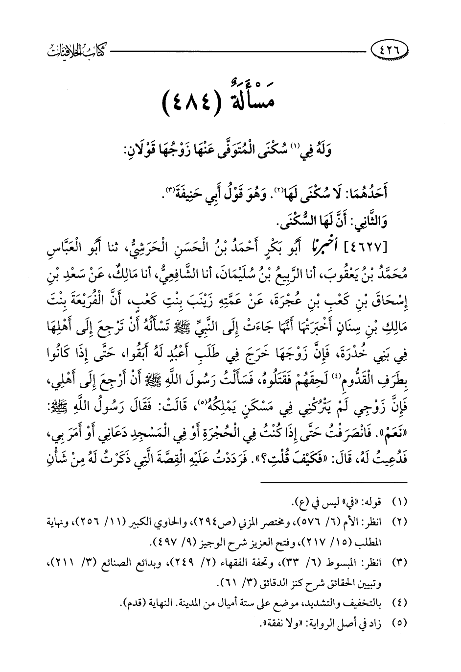 [4627] أخبرنا أَبُو بَكْرٍ أَحْمَدُ بْنُ الْحَسَنِ الْحَرَشِيُّ، ثنا أَبُو الْعَبَّاسِ مُحَمَّدُ بْنُ يَعْقُوبَ، أنا الرَّبِيعُ بْنُ سُلَيْمَانَ، أنا الشَّافِعِيُّ، أنا مَالِكٌ، عَنْ سَعْدِ بْنِ إِسْحَاقَ بْنِ كَعْبِ بْنِ عُجْرَةَ، عَنْ عَمَّتِهِ زَيْنَبَ بِنْتِ كَعْبٍ، أَنَّ الْفُرَيْعَةَ بِنْتَ مَالِكِ بْنِ سِنَانٍ أَخْبَرَتْهَا أَنَّهَا جَاءَتْ إِلَى النَّبِيِّ - صلى الله عليه وسلم - تَسْأَلُهُ أَنْ تَرْجِعَ إِلَى أَهْلِهَا فِي بَنِي خُدْرَةَ، فَإِنَّ زَوْجَهَا خَرَجَ فِي طَلَبِ أَعْبُدٍ لَهُ أَبَقُوا، حَتَّى إِذَا كَانُوا بِطَرَفِ الْقَدُّومِ (¬4) لَحِقَهُمْ فَقَتَلُوهُ، فَسَأَلْتُ رَسُولَ اللَّهِ - صلى الله عليه وسلم - أَنْ أَرْجِعَ إِلَى أَهْلِي، فَإِنَّ زَوْجِي لَمْ يَتْرُكْنِي فِي مَسْكَنٍ يَمْلِكُهُ (¬5)، قَالَتْ: فَقَالَ رَسُولُ اللَّهِ - صلى الله عليه وسلم -: "نَعَمْ". فَانْصَرَفْتُ حَتَّى إِذَا كُنْتُ فِي الْحُجْرَةِ أَوْ فِي الْمَسْجِدِ دَعَانِي أَوْ أَمَرَ بِي، فَدُعِيتُ لَهُ، قَالَ: "فَكَيْفَ قُلْتِ؟ ". فَرَدَدْتُ عَلَيْهِ الْقِصَّةَ الَّتِي ذَكَرْتُ لَهُ مِنْ شَأْنِ