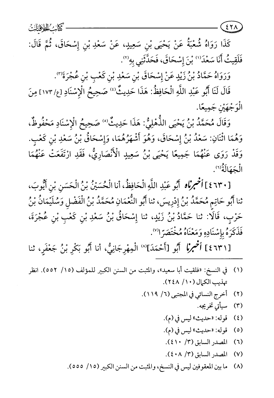 [4630] أخبرناه أَبُو عَبْدِ اللَّهِ الْحَافِظُ، أنا الْحُسَيْنُ بْنُ الْحَسَنِ بْنِ أَيُّوبَ، ثنا أَبُو حَاتِمٍ مُحَمَّدُ بْنُ إِدْرِيسَ، ثنا أَبُو النُّعْمَانِ مُحَمَّدُ بْنُ الْفَضْلِ وَسُلَيْمَانُ بْنُ حَرْبٍ، قَالَا: ثنا حَمَّادُ بْنُ زَيْدٍ، ثنا إِسْحَاقُ بْنُ سَعْدِ بْنِ كَعْبِ بْنِ عُجْرَةَ، فَذَكَرَهُ بِإِسْنَادِهِ وَمَعْنَاهُ مُخْتَصَرًا (¬7).
