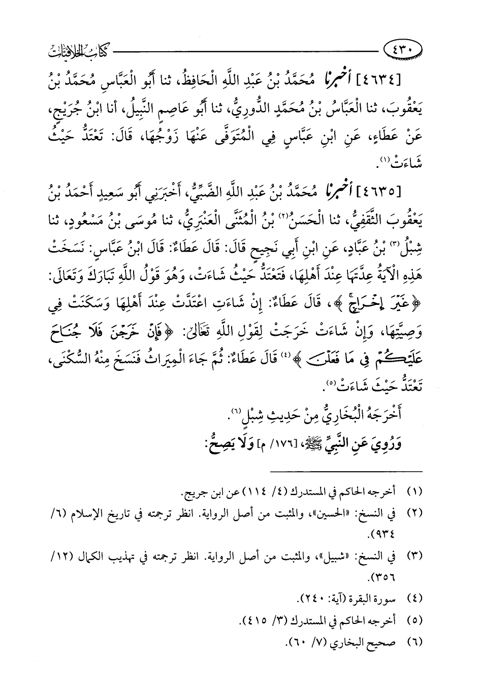 [4635] أخبرنا مُحَمَّدُ بْنُ عَبْدِ اللَّهِ الضَّبِّيُّ، أَخْبَرَنِي أَبُو سَعِيدٍ أَحْمَدُ بْنُ يَعْقُوبَ الثَّقَفِيُّ، ثنا الْحَسَنُ (¬2) بْنُ الْمُثَنَّى الْعَنْبَرِيُّ، ثنا مُوسَى بْنُ مَسْعُودٍ، ثنا شِبْلُ (¬3) بْنُ عَبَّادٍ، عَنِ ابْنِ أَبِي نَجِيحٍ قَالَ: قَالَ عَطَاءٌ: قَالَ ابْنُ عَبَّاسٍ: نَسَخَتْ هَذِهِ الْآيَةُ عِدَّتَهَا عِنْدَ أَهْلِهَا، فَتَعْتَدُّ حَيْثُ شَاءَتْ، وَهُوَ قَوْلُ اللَّهِ تَبَارَكَ وَتَعَالَى: {غَيْرَ إِخْرَاجٍ}، قَالَ عَطَاءٌ: إِنْ شَاءَتِ اعْتَدَّتْ عِنْدَ أَهْلِهَا وَسَكَنَتْ فِي وَصِيَّتِهَا، وَإِنْ شَاءَتْ خَرَجَتْ لِقَوْلِ اللَّهِ تَعَالى: {فَإِنْ خَرَجْنَ فَلَا جُنَاحَ عَلَيْكُمْ فِي مَا فَعَلْنَ} (¬4) قَالَ عَطَاءٌ: ثُمَّ جَاءَ الْمِيرَاثُ فَنَسَخَ مِنْهُ السُّكْنَى، تَعْتَدُّ حَيْثُ شَاءَتْ (¬5).