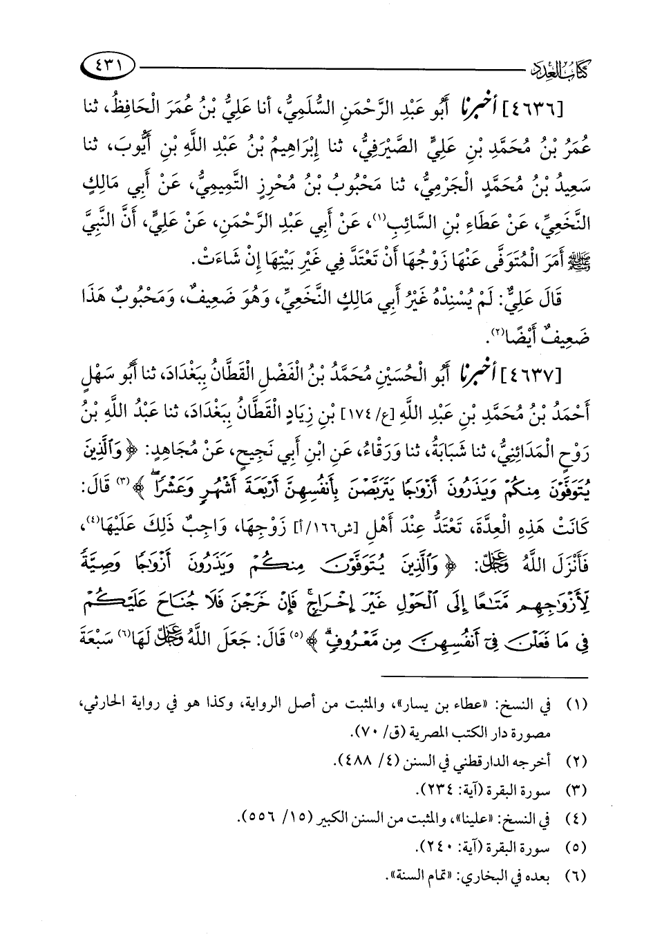 [4636] أخبرنا أَبُو عَبْدِ الرَّحْمَنِ السُّلَمِيُّ، أنا عَلِيُّ بْنُ عُمَرَ الْحَافِظُ، ثنا عُمَرُ بْنُ مُحَمَّدِ بْنِ عَلِيٍّ الصَّيْرَفِيُّ، ثنا إِبْرَاهِيمُ بْنُ عَبْدِ اللَّهِ بْنِ أَيُّوبَ، ثنا سَعِيدُ بْنُ مُحَمَّدٍ الْجَرْمِيُّ، ثنا مَحْبُوبُ بْنُ مُحْرِزٍ التَّمِيمِيُّ، عَنْ أَبِي مَالِكٍ النَّخَعِيِّ، عَنْ عَطَاءِ بْنِ السَّائِبِ (¬1)، عَنْ أَبِي عَبْدِ الرَّحْمَنِ، عَنْ عَلِيٍّ، أَنَّ النَّبِيَّ - صلى الله عليه وسلم - أَمَرَ الْمُتَوَفَّى عَنْهَا زَوْجُهَا أَنْ تَعْتَدَّ فِي غَيْرِ بَيْتِهَا إِنْ شَاءَتْ.