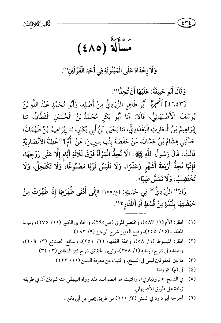 [4643] أخبرنا أَبُو طَاهِرٍ الزِّيَادِيُّ مِنْ أَصْلِهِ، وَأَبُو مُحَمَّدٍ عَبْدُ اللَّهِ بْنُ يُوسُفَ الْأَصْبَهَانِيُّ، قَالَا: أنا أَبُو بَكْرٍ مُحَمَّدُ بْنُ الْحُسَيْنِ الْقَطَّانُ، ثنا إِبْرَاهِيمُ بْنُ الْحَارِثِ الْبَغْدَادِيُّ، ثنا يَحْيَى بْنُ أَبِي بُكَيْرٍ، ثنا إِبْرَاهِيمُ بْنُ طَهْمَانَ، حَدَّثَنِي هِشَامُ بْنُ حَسَّانَ، عَنْ حَفْصَةَ بِنْتِ سِيرِينَ، عَنْ [أُمِّ] (¬3) عَطِيَّةَ الْأَنْصَارِيَّةِ قَالَتْ: قَالَ رَسُولُ اللَّهِ - صلى الله عليه وسلم -: "لَا تُحِدُّ الْمَرْأَةُ فَوْقَ ثَلَاثَةِ أَيَّامٍ إِلَّا عَلَى زَوْجِهَا، فَإِنَّهَا تُحِدُّ أَرْبَعَةَ أَشْهُرٍ وَعَشْرًا، وَلَا تَلْبَسُ ثَوْبًا مَصْبُوغًا، وَلَا تَكْتَحِلُ، وَلَا تَخْتَضِبُ، وَلَا تَمَسُّ طِيبًا".