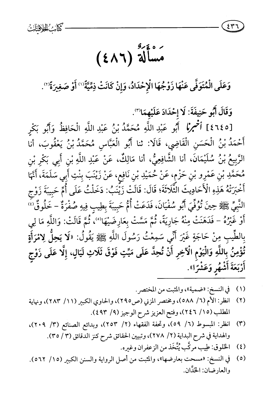 [4645] أخبرنا أَبُو عَبْدِ اللَّهِ مُحَمَّدُ بْنُ عَبْدِ اللَّهِ الْحَافِظُ وَأَبُو بَكْرٍ أَحْمَدُ بْنُ الْحَسَنِ الْقَاضِي، قَالَا: ثنا أَبُو الْعَبَّاسِ مُحَمَّدُ بْنُ يَعْقُوبَ، أنا الرَّبِيعُ بْنُ سُلَيْمَانَ، أنا الشَّافِعِيُّ، أنا مَالِكٌ، عَنْ عَبْدِ اللَّهِ بْنِ أَبِي بَكْرِ بْنِ مُحَمَّدِ بْنِ عَمْرِو بْنِ حَزْمٍ، عَنْ حُمَيْدِ بْنِ نَافِعٍ، عَنْ زَيْنَبَ بِنْتِ أَبِي سَلَمَةَ، أَنَّهَا أَخْبَرَتْهُ هَذِهِ الْأَحَادِيثَ الثَّلَاثَةَ؛ قَالَ: قَالَتْ زَيْنَبُ: دَخَلْتُ عَلَى أُمِّ حَبِيبَةَ زَوْجِ النَّبِيِّ - صلى الله عليه وسلم - حِينَ تُوُفِّيَ أَبُو سُفْيَانَ، فَدَعَتْ أُمُّ حَبِيبَةَ بِطِيبٍ فِيهِ صُفْرَةٌ - خَلُوقٌ (¬4) أَوْ غَيْرُهُ - فَدَهَنَتْ مِنْهُ جَارِيَةً، ثُمَّ مَسَّتْ بِعَارِضَيْهَا (¬5)، ثُمَّ قَالَتْ: وَاللَّهِ مَا لِي بِالطِّيبِ مِنْ حَاجَةٍ غَيْرَ أَنِّي سَمِعْتُ رَسُولَ اللَّهِ - صلى الله عليه وسلم - يَقُولُ: "لَا يَحِلُّ لِامْرَأَةٍ تُؤْمِنُ باللَّهِ وَالْيَوْمِ الْآخِرِ أَنْ تُحِدَّ عَلَى مَيِّتٍ فَوْقَ ثَلَاثِ لَيَالٍ، إِلَّا عَلَى زَوْجٍ أَرْبَعَةَ أَشْهُرٍ وَعَشْرًا".