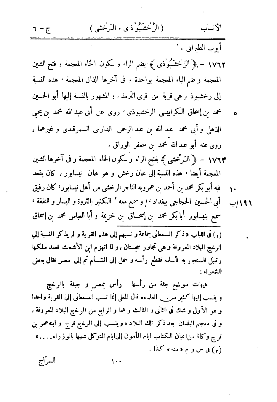 [1] في اللباب «ذكر السمعاني جماعة ونسبهم إلى هذه القرية ولم يذكر النسبة إلى الرخج البلاد المعروفة وهي تجاور سجستان، ولما انهزم ابن الأشعث قصد ملكها رتبيل فاستجار به فأسلمه فقطع رأسه وحمل إلى الشام ثم إلى مصر فقال بعض الشعراء:
