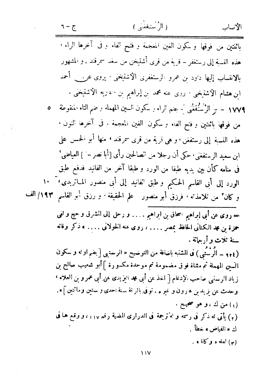بضم الراء وسكون السين المهملة وضم التاء المنقوطة من فوقها باثنتين وفتح الفاء وسكون الغين المعجمة وفي آخرها النون، هذه النسبة إلى رستفغن، وهي قرية من قرى سمرقند، منها أبو الحسن على ابن سعيد الرستغفني، حكى أن رجلا من الصالحين رأى [أبا نصر [1]-] العياضي [2] في منامه كأن بين يديه طبقا من الورد وطبقا آخر من الفانيد فدفع طبق الورد إلى أبى القاسم الحكيم وطبق الفانيد إلى أبى منصور الماتريدي، وكان [3] من تلامذته، فرزق أبو منصور علم الحقيقة، ورزق أبو القاسم
