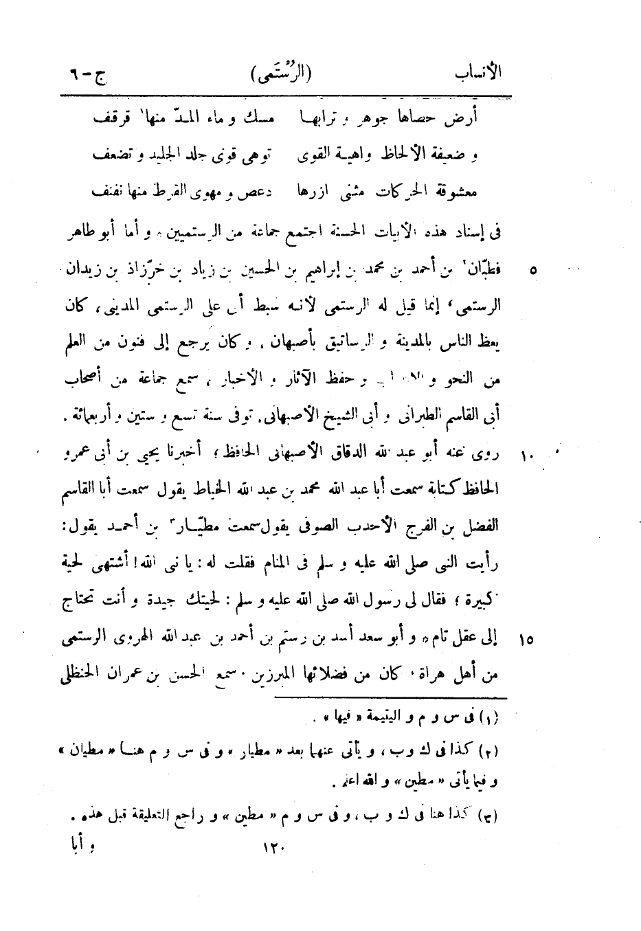 في إسناد هذه الأبيات الحسنة اجتمع جماعة من الرستميين، وأما أبو طاهر فطبّان [2] بن أحمد بن محمد بن إبراهيم بن الحسين بن زياد بن خرّزاذ بن زيدان الرستمي، إنما قيل له الرستمي لأنه سبط أبى على الرستمي المديني، كان يعظ الناس بالمدينة والرساتيق بأصبهان، وكان يرجع إلى فنون من العلم من النحو والاعراب وحفظ الآثار والأخبار، سمع جماعة من أصحاب أبى القاسم الطبراني وأبى الشيخ الأصبهاني، توفى سنة تسع وستين وأربعمائة، روى عنه أبو عبد الله الدقاق الأصبهاني الحافظ، أخبرنا يحيى بن أبى عمرو الحافظ كتابة سمعت أبا عبد الله محمد بن عبد الله الخياط يقول سمعت أبا القاسم الفضل بن الفرج الأحدب الصوفي يقول سمعت مطيّار [3] بن أحمد يقول: رأيت النبي صلى الله عليه وسلم في المنام فقلت له: يا نبي الله! أشتهى لحية كبيرة، فقال لي رسول الله صلى الله عليه وسلم: لحيتك جيدة وأنت تحتاج إلى عقل تام وأبو سعد أسد بن رستم بن أحمد بن عبد الله الهروي الرستمي من أهل هراة، كان من فضلائها المبرزين، سمع الحسن بن عمران الحنظليّ