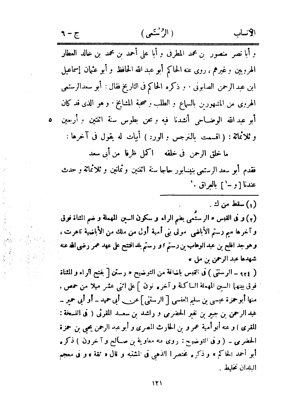 [2] وفي القبس «الرستمي بضم الراء وسكون السين المهملة وضم المثناة فوق وآخرها ميم رستم الإباضي مولى بنى أمية أول من ملك من الإباضية تاهرت، وهو جد افلح بن عبد الوهاب بن رستم، ورستم بلد افتتح على عهد عمر رضي الله عنه شهدها عبد الرحمن بن مل» (924- الرستنى) في القبس بإضافة من التوضيح «رستن [بفتح الراء والمثناة فوق بينهما السين المهملة الساكنة وآخره نون] على اثنى عشر ميلا من حمص، منها أبو حمزة عيسى بن سليم العنسيّ [الرستنى] عن أبى حميد- أو أبى حمير- عبد الرحمن بن جبير بن نفير الحضرميّ وراشد بن سعد المقرئي (في النسخة: