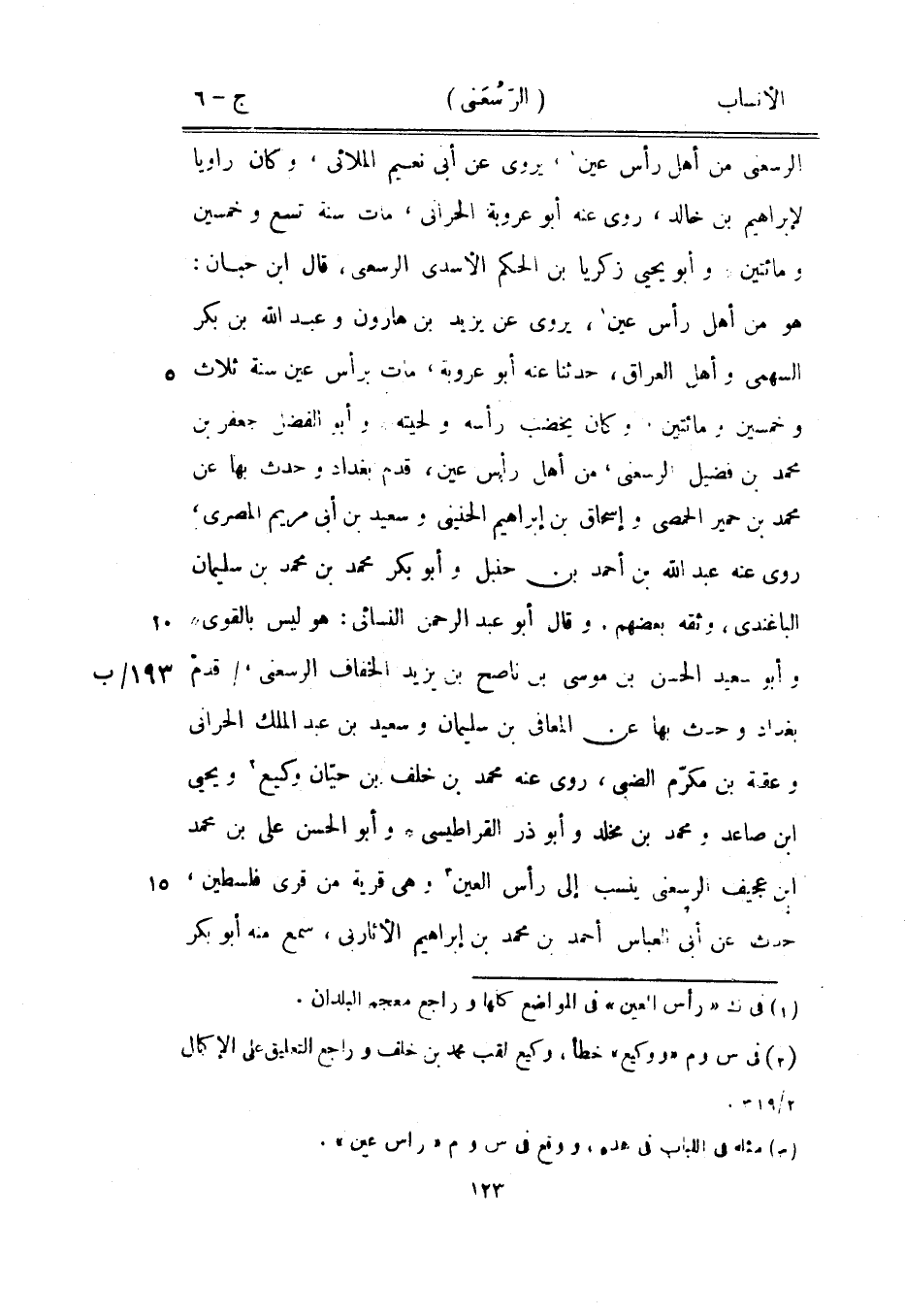 هو من أهل رأس عين [1] ، يروى عن يزيد بن هارون وعبد الله بن بكر السهمي وأهل العراق، حدثنا عنه أبو عروبة، مات برأس عين سنة ثلاث وخمسين ومائتين، وكان يخضب رأسه ولحيته وأبو الفضل جعفر بن محمد بن فضيل الرسعنى، من أهل رأس عين، قدم بغداد وحدث بها عن محمد بن حمير الحمصي وإسحاق بن إبراهيم الحنينى وسعيد بن أبى مريم المصري، روى عنه عبد الله بن أحمد بن حنبل وأبو بكر محمد بن محمد بن سليمان الباغندي، وثقه بعضهم، وقال أبو عبد الرحمن النسائي: هو ليس بالقوى وأبو سعيد الحسن بن موسى بن ناصح بن يزيد الخفاف الرسعنى،/ قدم بغداد وحدث بها عن المعافى بن سليمان وسعيد بن عبد الملك الحراني وعقبة بن مكرّم الضبيّ، روى عنه محمد بن خلف بن حيّان وكيع [2] ويحيى ابن صاعد ومحمد بن مخلد وأبو ذر القراطيسي وأبو الحسن على بن محمد ابن عجيف الرسعنى ينسب إلى رأس العين [3] وهي قرية من قرى فلسطين، حدث عن أبى العباس أحمد بن محمد بن إبراهيم الأثاربي، سمع منه أبو بكر