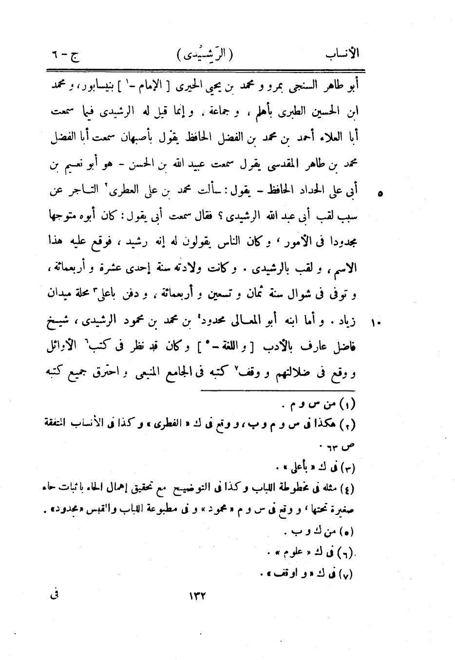 أبو طاهر السنجى بمرو ومحمد بن يحيى الحيريّ [الإمام-[1]] بنيسابور، ومحمد ابن الحسين الطبري بأهلم، وجماعة، وإنما قيل له الرشيديّ فيما سمعت أبا العلاء أحمد بن محمد بن الفضل الحافظ يقول بأصبهان سمعت أبا الفضل محمد بن طاهر المقدسي يقول سمعت عبيد الله بن الحسن- هو أبو نعيم بن أبى على الحداد الحافظ- يقول: سألت محمد بن على العطرى [2] التاجر عن سبب لقب أبى عبد الله الرشيديّ؟ فقال سمعت أبى يقول: كان أبوه متوجها مجدودا في الأمور، وكان الناس يقولون له إنه رشيد، فوقع عليه هذا الاسم، ولقب بالرشيدي. وكانت ولادته سنة إحدى عشرة وأربعمائة، وتوفى في شوال سنة ثمان وتسعين وأربعمائة، ودفن بأعلى [3] محلة ميدان زياد. وأما ابنه أبو المعالي محدود [4] بن محمد بن محمود الرشيديّ، شيخ فاضل عارف بالأدب [واللغة-[5]] وكان قد نظر في كتب [6] الأوائل ووقع في ضلالتهم ووقف [7] كتبه في الجامع المنيعى واحترق جميع كتبه