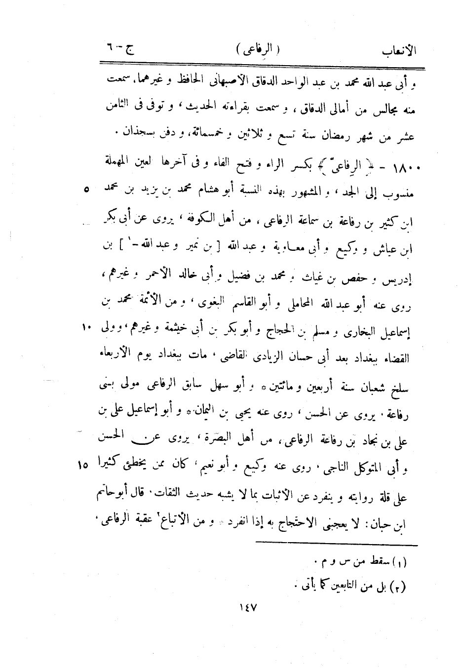 بكسر الراء وفتح الفاء وفي آخرها لعين المهملة منسوب إلى الجد، والمشهور بهذه النسبة أبو هشام محمد بن يزيد بن محمد ابن كثير بن رفاعة بن سماعة الرفاعيّ، من أهل الكوفة، يروى عن أبى بكر ابن عياش ووكيع وأبى معاوية وعبد الله [بن نمير وعبد الله-[1]] بن إدريس وحفص بن غياث ومحمد بن فضيل وأبى خالد الأحمر وغيرهم، روى عنه أبو عبد الله المحاملي وأبو القاسم البغوي، ومن الأئمة محمد بن إسماعيل البخاري ومسلم بن الحجاج وأبو بكر بن أبى خيثمة وغيرهم، وولى القضاء ببغداد بعد أبى حسان الزيادي القاضي، مات ببغداد يوم الأربعاء سلخ شعبان سنة أربعين ومائتين وأبو سهل سابق الرفاعيّ مولى بنى رفاعة، يروى عن الحسن، روى عنه يحيى بن اليمان وأبو إسماعيل على بن على بن نجاد بن رفاعة الرفاعيّ، من أهل البصرة، يروى عن الحسن وأبى المتوكل الناجي، روى عنه وكيع وأبو نعيم، كان ممن يخطئ كثيرا على قلة روايته وينفرد عن الأثبات بما لا يشبه حديث الثقات، قال أبو حاتم ابن حبان: لا يعجبني الاحتجاج به إذا انفرد ومن الأتباع [2] عقبة الرفاعيّ،