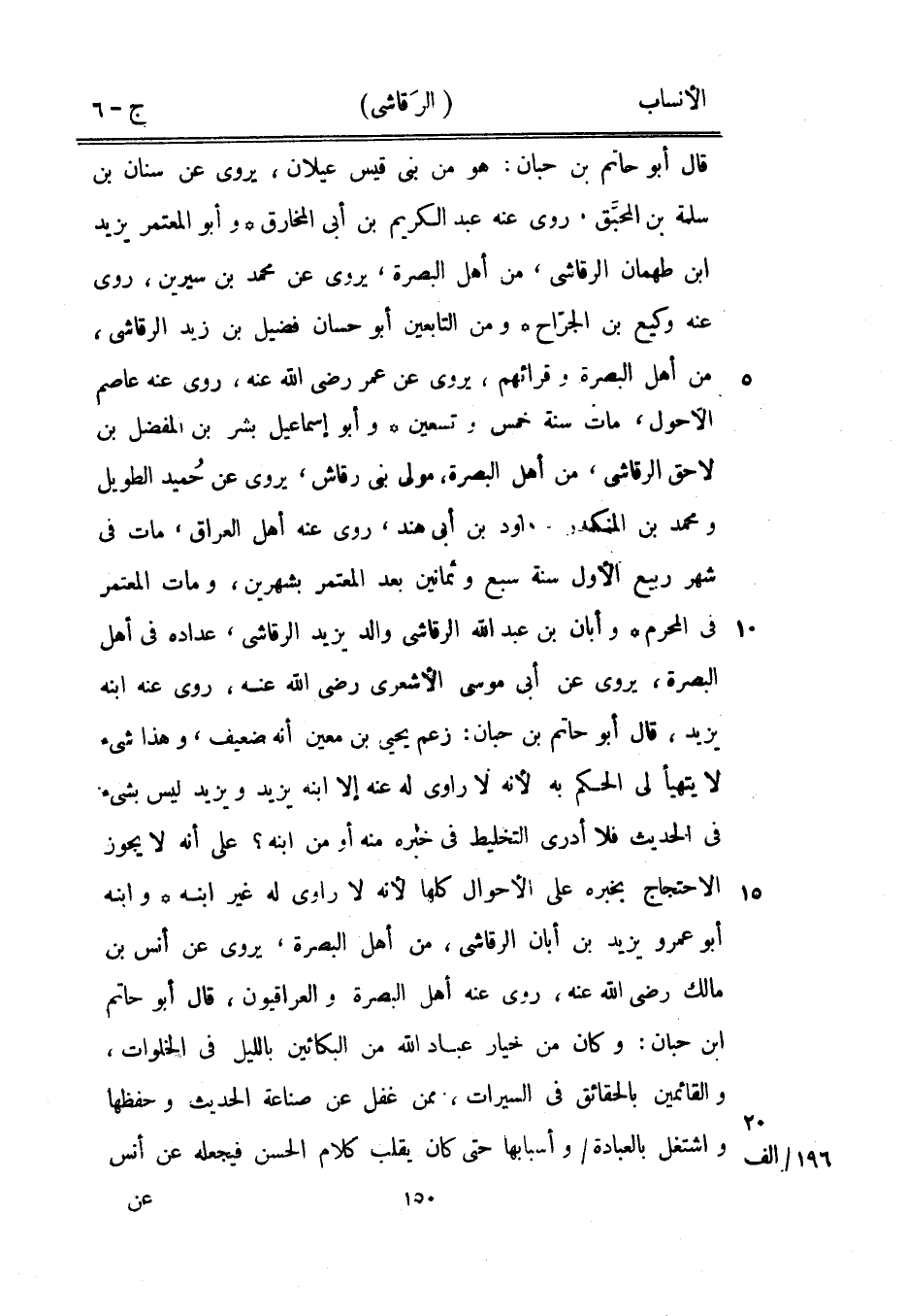 قال أبو حاتم بن حبان: هو من بنى قيس عيلان، يروى عن سنان بن سلمة بن المحبّق، روى عنه عبد الكريم بن أبى المخارق وأبو المعتمر يزيد ابن طهمان الرقاشيّ، من أهل البصرة، يروى عن محمد بن سيرين، روى عنه وكيع بن الجرّاح ومن التابعين أبو حسان فضيل بن زيد الرقاشيّ، من أهل البصرة وقرائهم، يروى عن عمر رضي الله عنه، روى عنه عاصم الأحول، مات سنة خمس وتسعين وأبو إسماعيل بشر بن المفضل بن لاحق الرقاشيّ، من أهل البصرة، مولى بنى رقاش، يروى عن حميد الطويل ومحمد بن المنكدر وداود بن أبى هند، روى عنه أهل العراق، مات في شهر ربيع الأول سنة سبع وثمانين بعد المعتمر بشهرين، ومات المعتمر في المحرم وأبان بن عبد الله الرقاشيّ والد يزيد الرقاشيّ، عداده في أهل البصرة، يروى عن أبى موسى الأشعري رضي الله عنه، روى عنه ابنه يزيد، قال أبو حاتم بن حبان: زعم يحيى بن معين أنه ضعيف، وهذا شيء لا يتهيأ لي الحكم به لأنه لا راوي له عنه إلا ابنه يزيد ويزيد ليس بشيء في الحديث فلا أدرى التخليط في خبره منه أو من ابنه؟ على أنه لا يجوز الاحتجاج بخبره على الأحوال كلها لأنه لا راوي له غير ابنه وابنه أبو عمرو يزيد بن أبان الرقاشيّ، من أهل البصرة، يروى عن أنس بن مالك رضي الله عنه، روى عنه أهل البصرة والعراقيون، قال أبو حاتم ابن حبان: وكان من خيار عباد الله من البكاءين بالليل في الخلوات، والقائمين بالحقائق في السيرات، ممن غفل عن صناعة الحديث وحفظها واشتغل بالعبادة/ وأسبابها حتى كان يقلب كلام الحسن فيجعله عن أنس