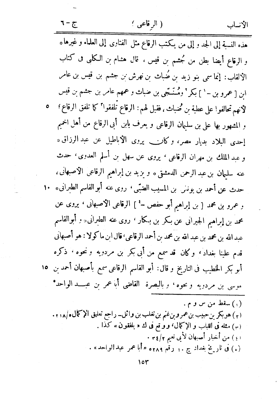 هذه النسبة إلى الجد وإلى من يكتب الرقاع مثل الفتاوى إلى العلماء وغيرها والرقاع أيضا بطن من جشم بن قيس، قال هشام بن الكلبي في كتاب الألقاب: إنما سمى بنو زيد بن ضباث بن نهرش بن جشم بن قيس بن عامر ابن [عمرو بن-[1]] بكر [2] ومنجّى بن ضباث وعمهم عامر بن جشم بن قيس لأنهم تحالفوا على عطية بن ضباث، فقيل لهم: الرقاع تلفقوا [3] كما تلفق الرقاع، والمشهور بها على بن سليمان الرقاعى ويعرف بابن أبى الرقاع من أهل اخميم إحدى البلاد بديار مصر، وكان يروى الأباطيل عن عبد الرزاق وعبد الملك بن مهران الرقاعى، يروى عن سهل بن أسلم العدوي، حدث عنه سليمان بن عبد الرحمن الدمشقيّ ويزيد بن إبراهيم الرقاعى الأصبهاني، حدث عن أحمد بن يونس بن المسيب الضّبى، روى عنه أبو القاسم الطبراني وعمرو بن محمد [بن إبراهيم أبو حفص-[4]] الرقاعى الأصبهاني، يروى عن محمد بن إبراهيم الجيراني عن بكر بن بكار، روى عنه الطبراني وأبو القاسم عبد الله بن محمد بن عبد الله بن محمد بن أحمد الرقاعى، قال ابن ماكولا: هو أصبهانيّ قدم علينا بغداد، وكان قد سمع من أبى بكر بن مردويه ونحوه، ذكره أبو بكر الخطيب في التاريخ وقال: أبو القاسم الرقاعى سمع بأصبهان أحمد بن موسى بن مردويه ونحوه، وبالبصرة القاضي أبا عمر بن عبد الواحد [5]