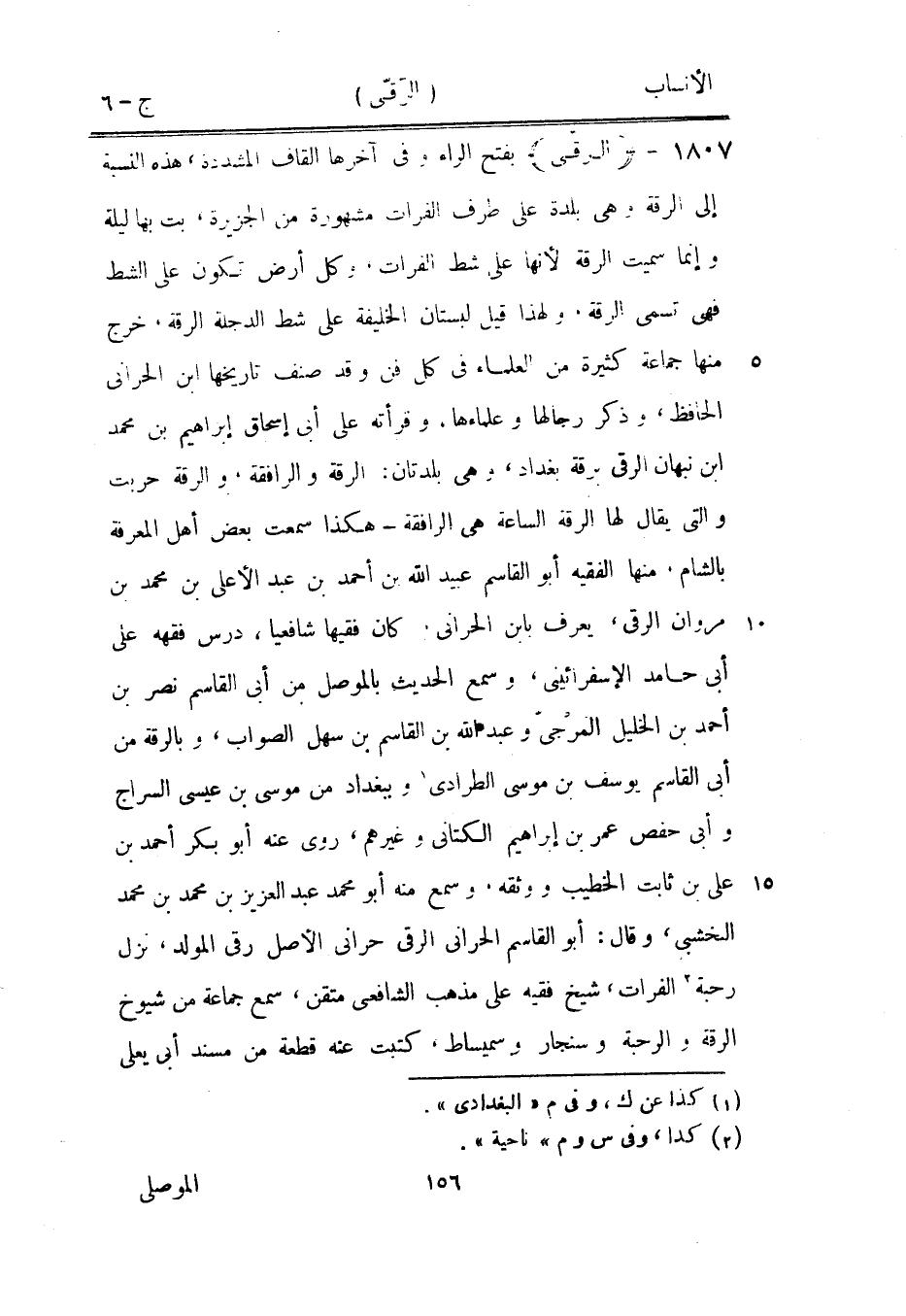 بفتح الراء وفي آخرها القاف المشددة، هذه النسبة إلى الرقة وهي بلدة على طرف الفرات مشهورة من الجزيرة، بت بها ليلة وإنما سميت الرقة لأنها على شط الفرات، وكل أرض تكون على الشط فهي تسمى الرقة، ولهذا قيل لبستان الخليفة على شط الدجلة الرقة، خرج منها جماعة كثيرة من العلماء في كل فن وقد صنف تاريخها ابن الحراني الحافظ، وذكر رجالها وعلماءها، وقرأته على أبى إسحاق إبراهيم بن محمد ابن نبهان الرقى برقة بغداد، وهي بلدتان: الرقة والرافقة، والرقة حربت والتي يقال لها الرقة الساعة هي الرافقة- هكذا سمعت بعض أهل المعرفة بالشام، منها الفقيه أبو القاسم عبيد الله بن أحمد بن عبد الأعلى بن محمد بن مروان الرقى، يعرف بابن الحراني، كان فقيها شافعيا، درس فقهه على أبى حامد الأسفراييني، وسمع الحديث بالموصل من أبى القاسم نصر بن أحمد بن الخليل المرجى وعبد الله بن القاسم بن سهل الصواب، وبالرقة من أبى القاسم يوسف بن موسى الطرادى [1] وببغداد من موسى بن عيسى السراج وأبى حفص عمر بن إبراهيم الكتاني وغيرهم، روى عنه أبو بكر أحمد بن على بن ثابت الخطيب ووثقه، وسمع منه أبو محمد عبد العزيز بن محمد بن محمد النخشبى، وقال: أبو القاسم الحراني الرقى حرانى الأصل رقى المولد، نزل رحبة [2] الفرات، شيخ فقيه على مذهب الشافعيّ متقن، سمع جماعة من شيوخ الرقة والرحبة وسنجار وسميساط، كتبت عنه قطعة من مسند أبى يعلى