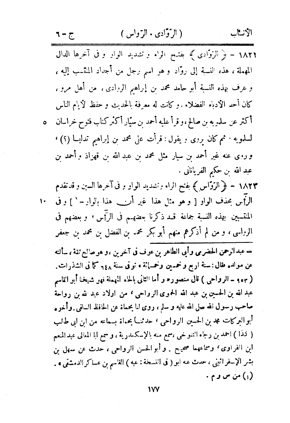 بفتح الراء وتشديد الواو وفي آخرها الدال المهملة، هذه النسبة إلى روّاد وهو اسم رجل من أجداد المنتسب إليه، وعرف بهذه النسبة أبو حامد محمد بن إبراهيم الروادى، من أهل مرو، كان أحد الأدباء الفضلاء، وكانت له معرفة بالحديث وحفظ لأيام الناس أكثر عن سلمويه بن صالح، وقرأ عليه أحمد بن سيّار أكثر كتاب فتوح خراسان لسلمويه، ثم كان يروى ويقول: قرأت على محمد بن إبراهيم تدليسا (؟) ، وروى عنه غير أحمد بن سيار مثل محمد بن عبد الله بن قهزاذ وأحمد بن عبد الله بن حكيم الفريانانى.