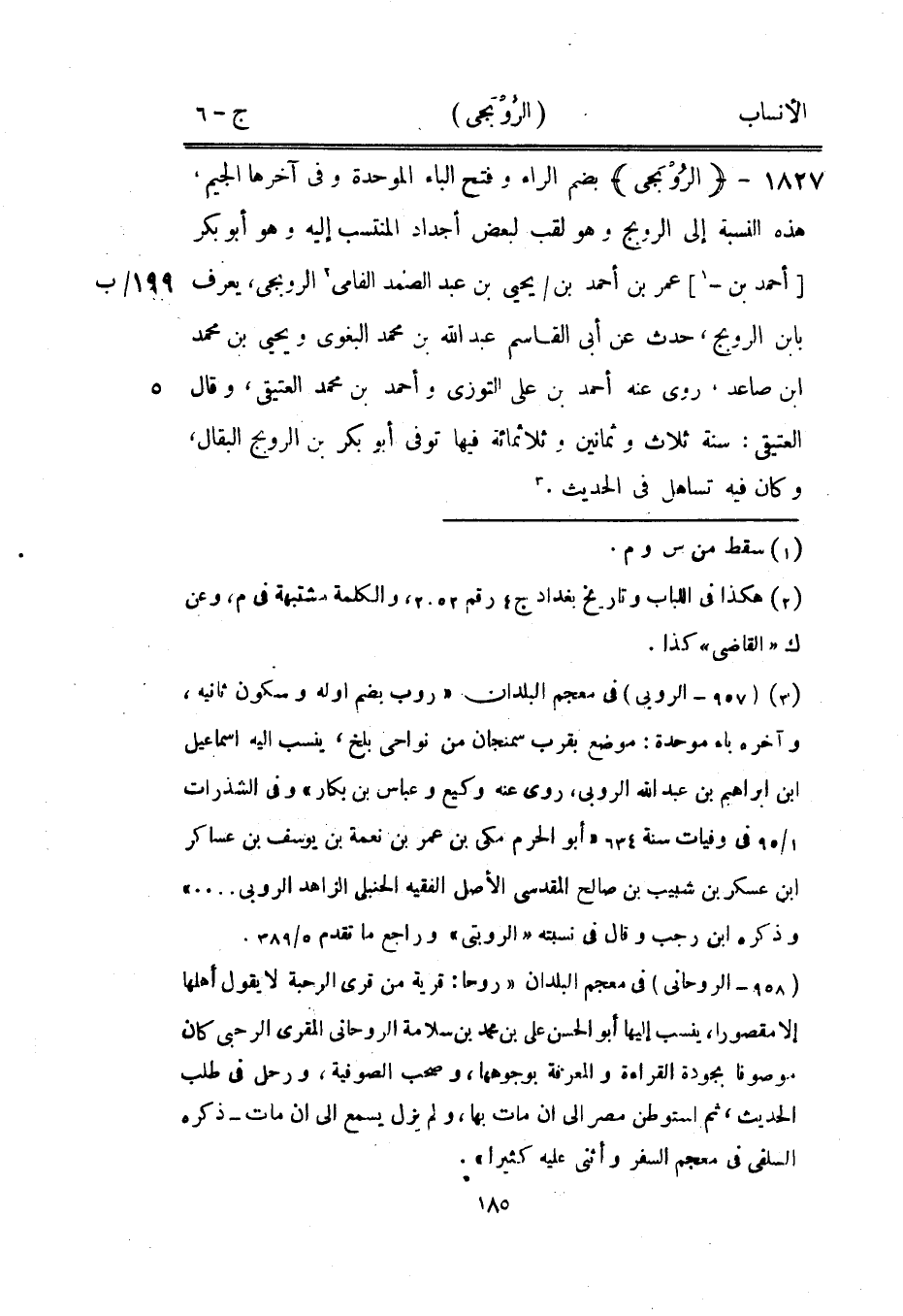 [3] (957- الروبى) في معجم البلدان «روب بضم اوله وسكون ثانيه، وآخره باء موحدة: موضع بقرب سمنجان من نواحي بلخ، ينسب اليه إسماعيل ابن إبراهيم بن عبد الله الروبى، روى عنه وكيع وعباس بن بكار» وفي الشذرات 1/ 95 في وفيات سنة 634 «أبو الحرم مكي بن عمر بن نعمة بن يوسف بن عساكر ابن عسكر بن شبيب بن صالح المقدسي الأصل الفقيه الحنبلي الزاهد الروبى ... » وذكره ابن رجب وقال في نسبته «الروبتى» وراجع ما تقدم 5/ 389.