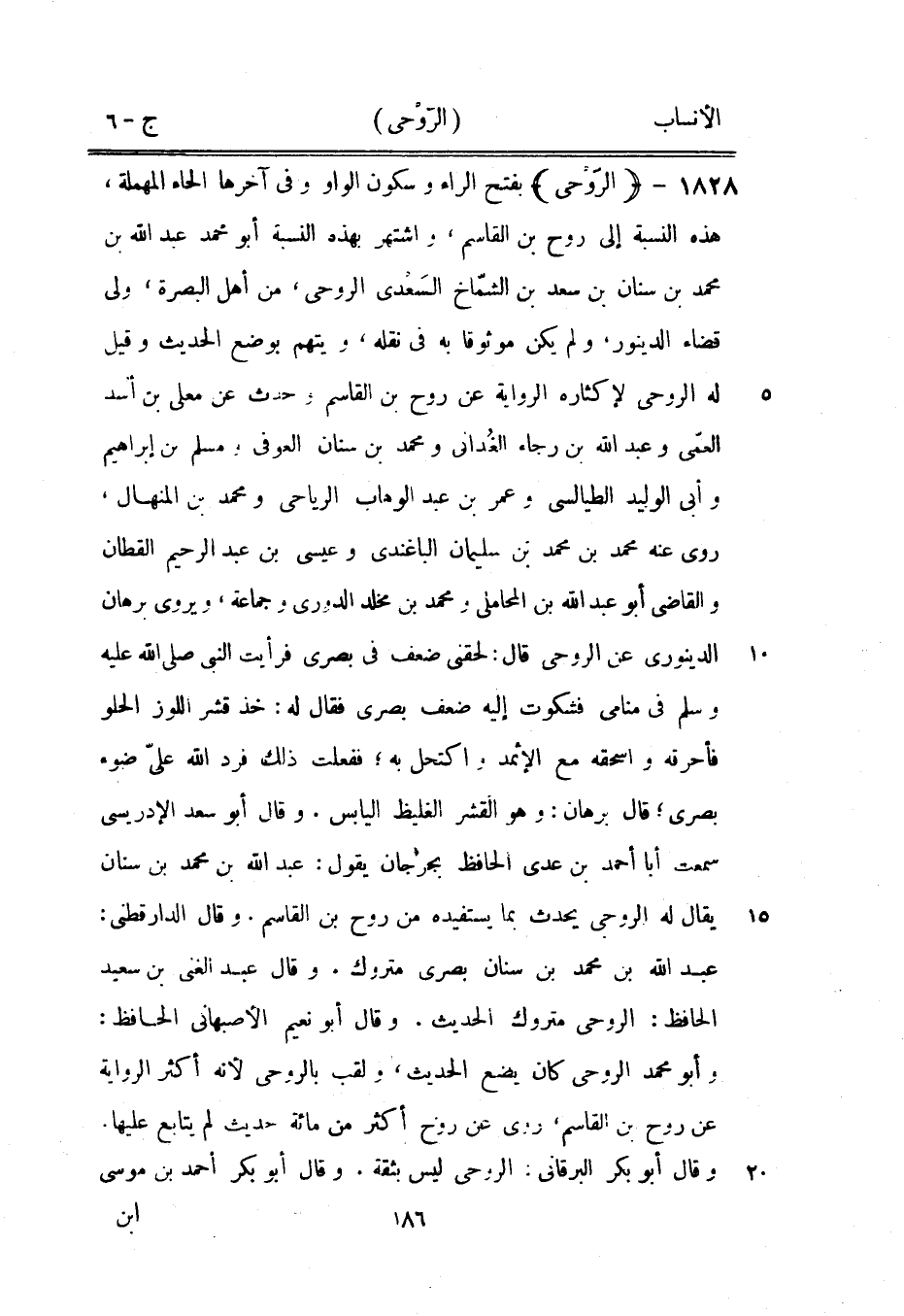 بفتح الراء وسكون الواو وفي آخرها الحاء المهملة، هذه النسبة إلى روح بن القاسم، واشتهر بهذه النسبة أبو حمد عبد الله بن محمد بن سنان بن سعد بن الشمّاخ السعدي الروحي، من أهل البصرة، ولى قضاء الدينور، ولم يكن موثوقا به في نقله، ويتهم بوضع الحديث وقيل له الروحي لإكثاره الرواية عن روح بن القاسم وحدث عن معلى بن أسد العمّى وعبد الله بن رجاء الغداني ومحمد بن سنان العوفيّ ومسلم بن إبراهيم وأبى الوليد الطيالسي وعمر بن عبد الوهاب الرياحي ومحمد بن المنهال، روى عنه محمد بن محمد بن سليمان الباغندي وعيسى بن عبد الرحيم القطان والقاضي أبو عبد الله بن المحاملي ومحمد بن مخلد الدوري وجماعة، ويروى برهان الدينَوَريّ عن الروحي قال: لحقني ضعف في بصرى فرأيت النبي صلى الله عليه وسلم في منامي فشكوت إليه ضعف بصرى فقال له: خذ قشر اللوز الحلو فأحرقه وأسحقه مع الإثمد واكتحل به، ففعلت ذلك فرد الله عليّ ضوء بصرى، قال برهان: وهو القشر الغليظ اليابس. وقال أبو سعد الإدريسي سمعت أبا أحمد بن عدي الحافظ بجرجان يقول: عبد الله بن محمد بن سنان يقال له الروحي يحدث بما يستفيده من روح بن القاسم. وقال الدار قطنى: