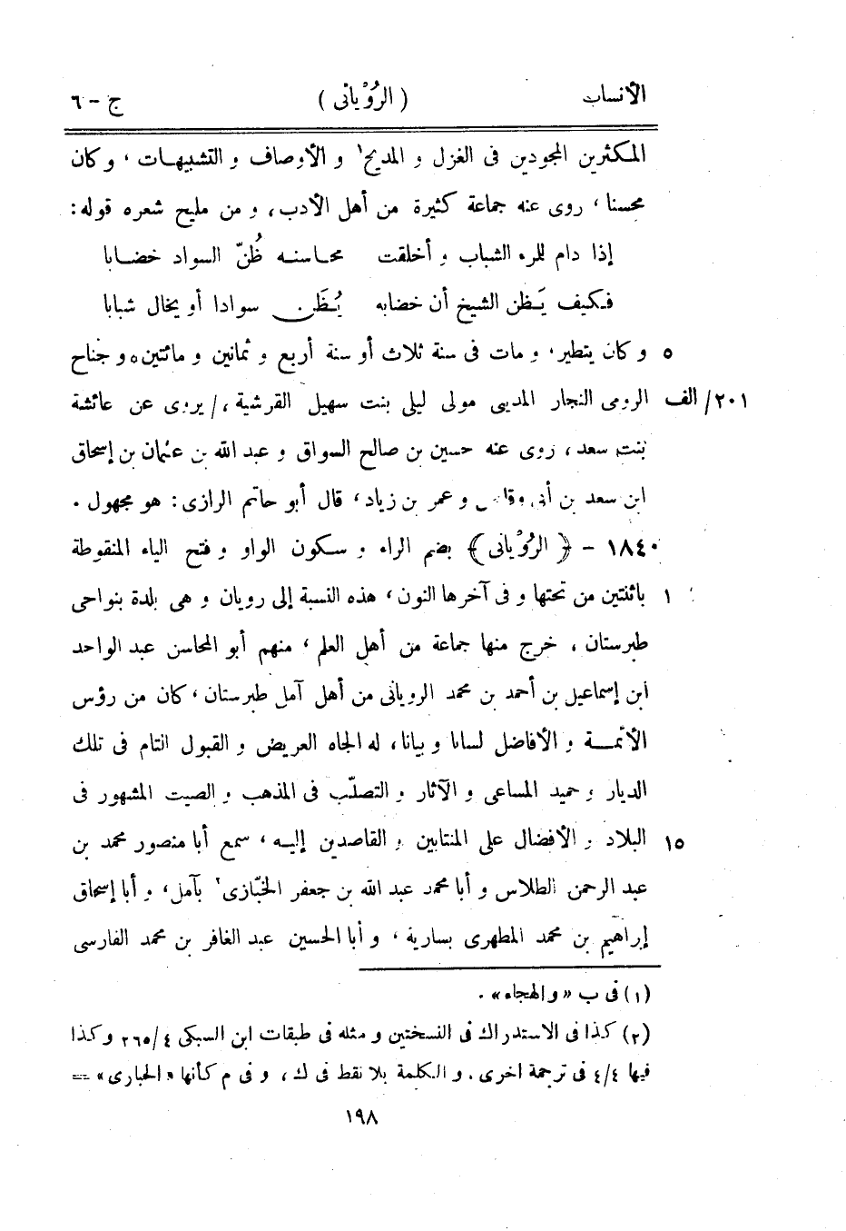 بضم الراء وسكون الواو وفتح الياء المنقوطة باثنتين من تحتها وفي آخرها النون، هذه النسبة إلى رويان وهي بلدة بنواحي طبرستان، خرج منها جماعة من أهل العلم، منهم أبو المحاسن عبد الواحد ابن إسماعيل بن أحمد بن محمد الروياني من أهل آمل طبرستان، كان من رءوس الأئمة والأفاضل لسانا وبيانا، له الجاه العريض والقبول التام في تلك الديار وحميد المساعي والآثار والتصلّب في المذهب والصيت المشهور في البلاد والإفضال على المنتابين والقاصدين إليه، سمع أبا منصور محمد بن عبد الرحمن الطلاس وأبا محمد عبد الله بن جعفر الخبّازى [2] بآمل، وأبا إسحاق إبراهيم بن محمد المطهري بسارية، وأبا الحسين عبد الغافر بن محمد الفارسي