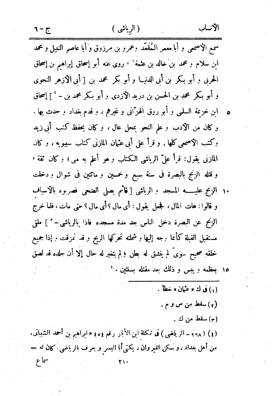 وكان من الأدب وعلم النحو بمحل عال، وكان يحفظ كتب أبى زيد وكتب الأصمعي كلها، وقرأ على أبى عثمان المازني كتاب سيبويه، وكان المازني يقول: قرأ عليّ الرياشي الكتاب وهو أعلم به منى، وكان ثقة، وقتله الزنج بالبصرة في سنة سبع وخمسين ومائتين في شوال ودخلت الزنج عليه المسجد والرياشي [قائم يصلى الضحى فضربوه بالأسياف وقالوا: هات المال، فجعل يقول: أي مال؟ أي مال؟ حتى مات، فلما خرج الزنج عن البصرة دخل الناس بعد مدة مسجده فإذا بالرياشى-[3]] ملقى مستقبل القبلة كأنما وجه إليها وشملته تحركها الريح وقد تمزقت وإذا جميع خلقه صحيح سويّ لم ينشق له بطن ولم يتغير له حال إلا أن جلده قد لصق بعظمه ويبس وذلك بعد مقتله بسنتين. [4]