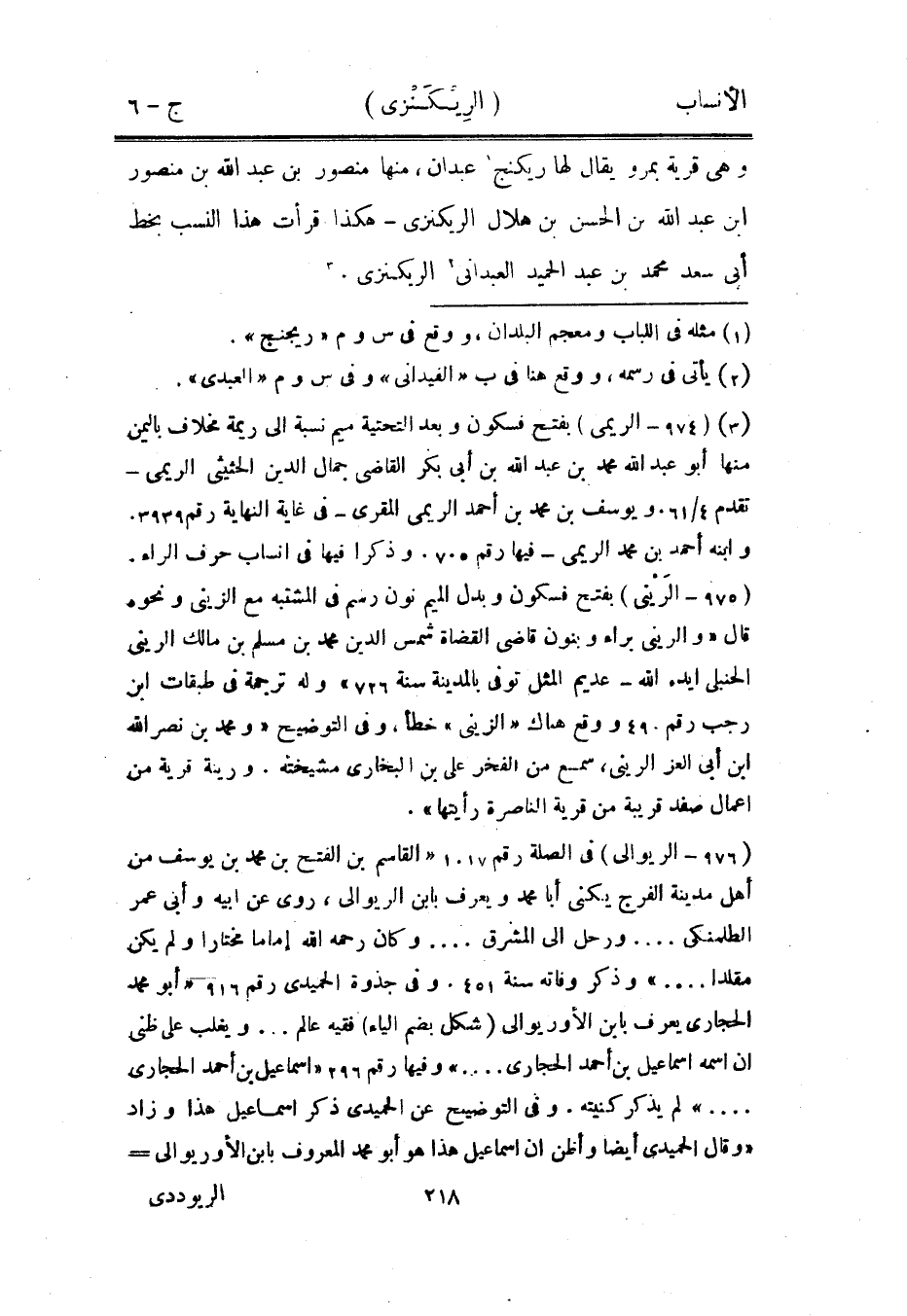 (975- الرينى) بفتح فسكون وبدل الميم نون رسم في المشتبه مع الزينى ونحوه قال «والرينى براء وبنون قاضى القضاة شمس الدين محمد بن مسلم بن مالك الرينى الحنبلي أيده الله- عديم المثل توفى بالمدينة سنة 726» وله ترجمة في طبقات ابن رجب رقم 490 ووقع هناك «الزينى» خطأ، وفي التوضيح «ومحمد بن نصر الله ابن أبى العز الرينى، سمع من الفخر على بن البخاري مشيخته. ورينة قرية من اعمال صفد قريبة من قرية الناصرة رأيتها» .