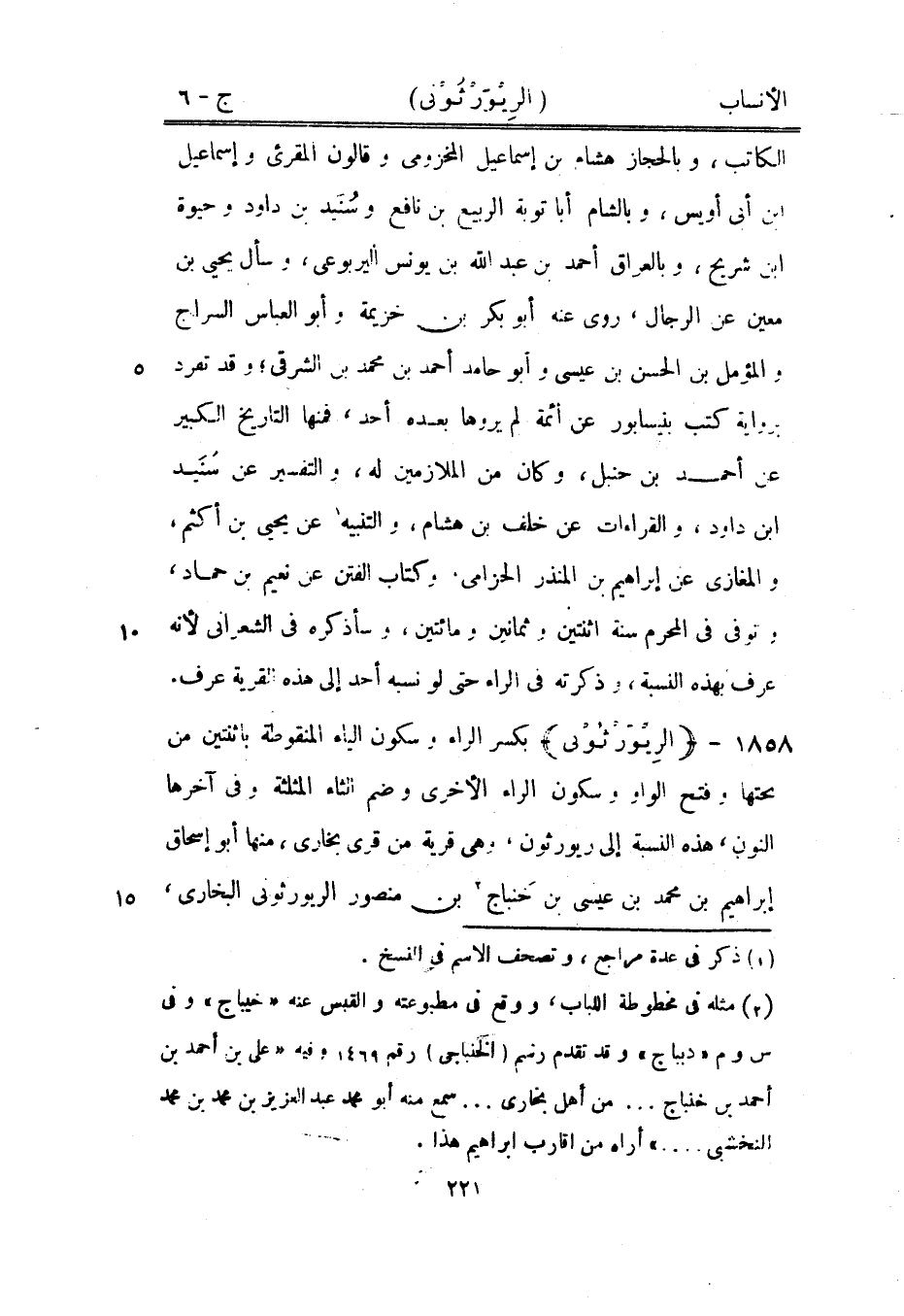 الكاتب، وبالحجاز هشام بن إسماعيل المخزومي وقالون المقرئ وإسماعيل ابن أبى أويس، وبالشام أبا توبة الربيع بن نافع وسنيد بن داود وحيوة ابن شريح، وبالعراق أحمد بن عبد الله بن يونس اليربوعي، وسأل يحيى بن معين عن الرجال، روى عنه أبو بكر بن خزيمة وأبو العباس السراج والمؤمل بن الحسن بن عيسى وأبو حامد أحمد بن محمد بن الشرقي، وقد تفرد برواية كتب بنيسابور عن أئمة لم يروها بعده أحد، فمنها التاريخ الكبير عن أحمد بن حنبل، وكان من الملازمين له، والتفسير عن سنيد ابن داود، والقراءات عن خلف بن هشام، والتنبيه [1] عن يحيى بن أكثم، والمغازي عن إبراهيم بن المنذر الحزامي، وكتاب الفتن عن نعيم بن حماد، وتوفى في المحرم سنة اثنتين وثمانين ومائتين، وسأذكره في الشعراني لأنه عرف بهذه النسبة، وذكرته في الراء حتى لو نسبه أحد إلى هذه القرية عرف.