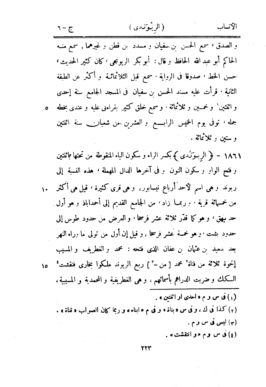 بكسر الراء وسكون الياء المنقوطة من تحتها باثنتين وفتح الواو وسكون النون وفي آخرها الدال المهملة، هذه النسبة إلى ربوند وهي اسم لأحد أرباع نيسابور، وهي قرى كثيرة، قيل هي أكثر من خمسمائة قرية، وربما زاد، من الجامع القديم إلى أحمداباذ وهو أول حد بيهق، وهو كما قدّر ثلاثة عشر فرسخا، والعرض من حدود طوس إلى حدود بشت، وهو خمسة عشر فرسخا، وقيل إن أول من تولى ما وراء النهر بعد سعيد بن عثمان بن عفان الّذي فتحه: محمد والغطريف والمسيب إخوة ثلاثة من فتاة [2] محمد [من-[3]] ربع الريوند ملكوا بخارى فنقشت [4] السكك وضربت الدراهم بأسمائهم، وهي الغطريفية والمحمدية والمسيبية،