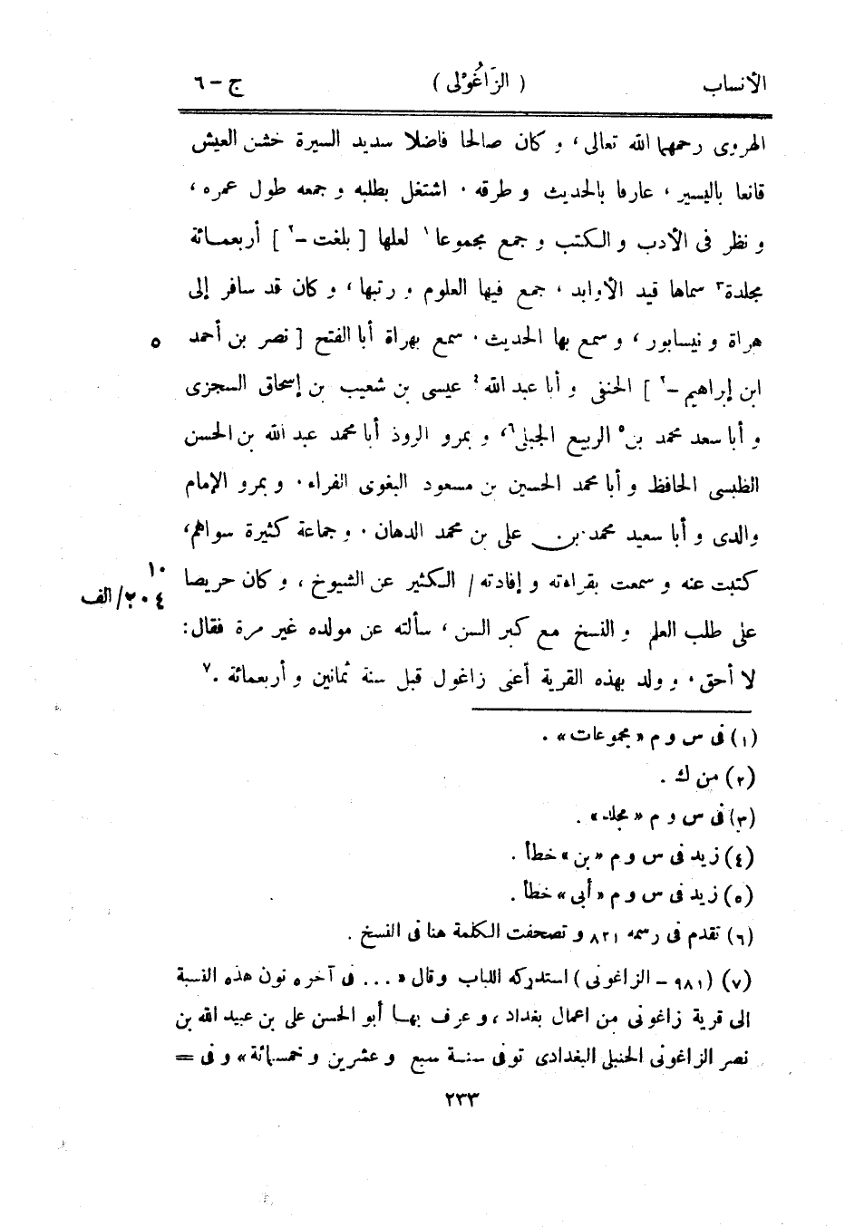[7] (981- الزاغونى) استدركه اللباب وقال « ... في آخره نون هذه النسبة الى قرية زاغونى من اعمال بغداد، وعرف بها أبو الحسن على بن عبيد الله بن نصر الزاغونى الحنبلي البغدادي توفى سنة سبع وعشرين وخمسمائة» وفي