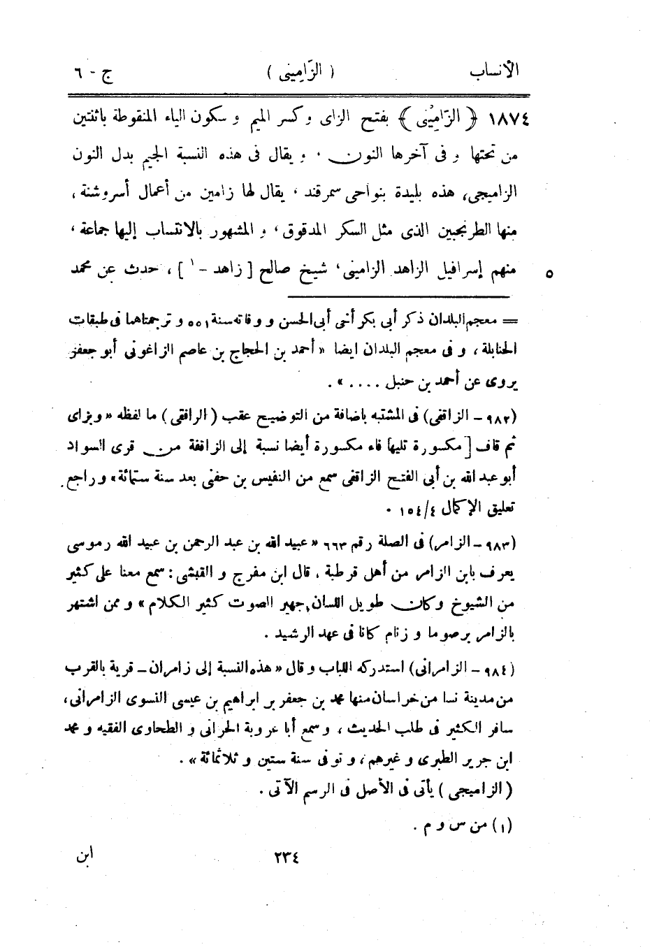 (984- الزامرانى) استدركه اللباب وقال «هذه النسبة إلى زامران- قرية بالقرب من مدينة نسا من خراسان منها محمد بن جعفر بن إبراهيم بن عيسى النسوي الزامرانى، سافر الكثير في طلب الحديث، وسمع أبا عروبة الحراني والطحاوي الفقيه ومحمد ابن جرير الطبري وغيرهم، وتوفى سنة ستين وثلاثمائة» .