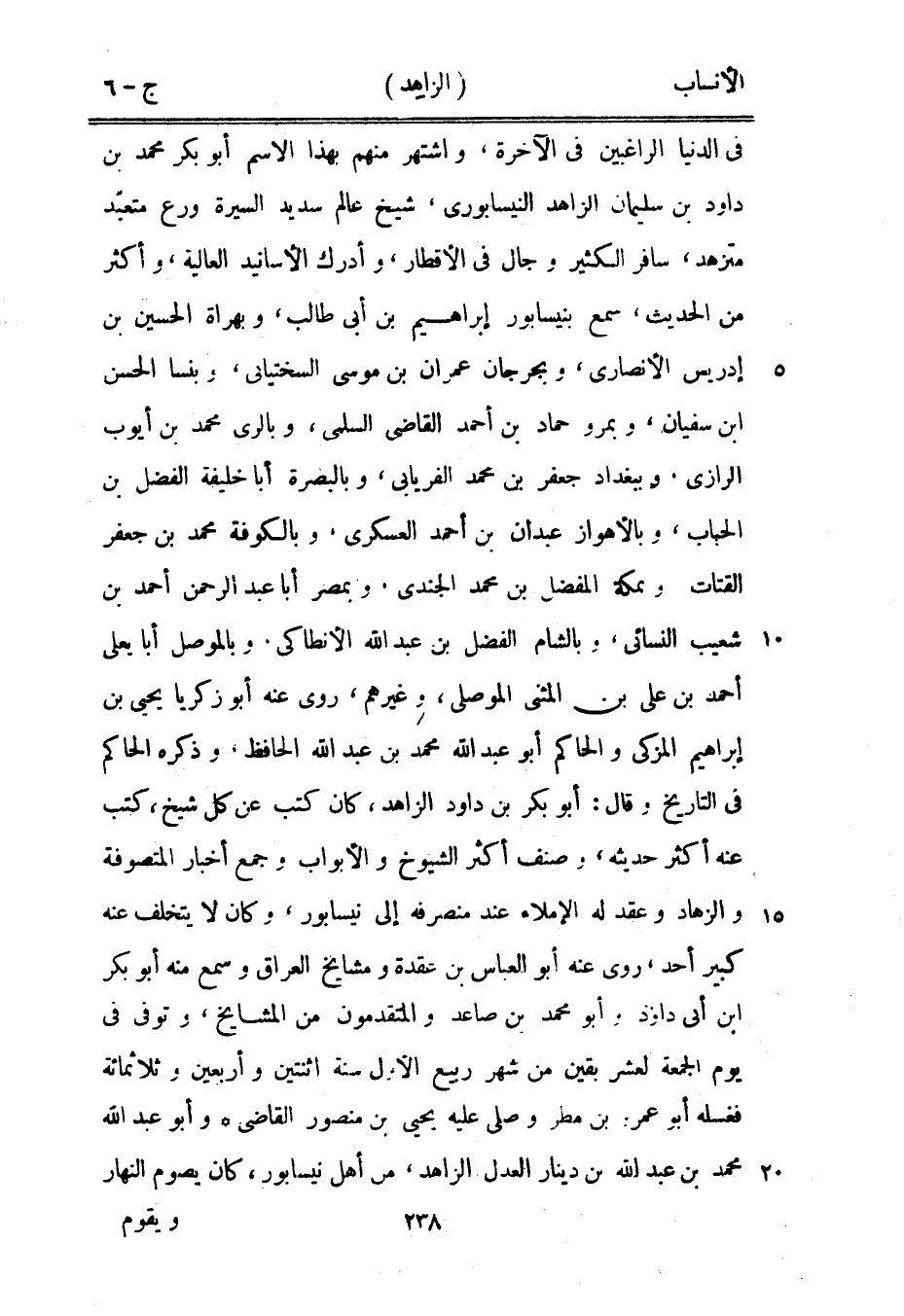 في الدنيا الراغبين في الآخرة، واشتهر منهم بهذا الاسم أبو بكر محمد بن داود بن سليمان الزاهد النيسابورىّ، شيخ عالم سديد السيرة ورع متعبّد متزهد، سافر الكثير وجال في الأقطار، وأدرك الأسانيد العالية، وأكثر من الحديث، سمع بنيسابور إبراهيم بن أبى طالب، وبهراة الحسين بن إدريس الأنصاري، وبجرجان عمران بن موسى السختياني، وبنسا الحسن ابن سفيان، وبمرو حماد بن أحمد القاضي السلمي، وبالري محمد بن أيوب الرازيّ، وببغداد جعفر بن محمد الفريابي، وبالبصرة أبا خليفة الفضل بن الحباب، وبالأهواز عبدان بن أحمد العسكري، وبالكوفة محمد بن جعفر القتات وبمكة المفضل بن محمد الجندي، وبمصر أبا عبد الرحمن أحمد بن شعيب النسائي، وبالشام الفضل بن عبد الله الأنطاكي، وبالموصل أبا يعلى أحمد بن على بن المثنى الموصلي، وغيرهم، روى عنه أبو زكريا يحيى بن إبراهيم المزكي والحاكم أبو عبد الله محمد بن عبد الله الحافظ، وذكره الحاكم في التاريخ وقال: أبو بكر بن داود الزاهد، كان كتب عن كل شيخ، كتب عنه أكثر حديثه، وصنف أكثر الشيوخ والأبواب وجمع أخبار المتصوفة والزهاد وعقد له الإملاء عند منصرفه إلى نيسابور، وكان لا يتخلف عنه كبير أحد، روى عنه أبو العباس بن عقدة ومشايخ العراق وسمع منه أبو بكر ابن أبى داود وأبو محمد بن صاعد والمتقدمون من المشايخ، وتوفى في يوم الجمعة لعشر بقين من شهر ربيع الأول سنة اثنتين وأربعين وثلاثمائة فغسله أبو عمرو بن مطر وصلى عليه يحيى بن منصور القاضي وأبو عبد الله محمد بن عبد الله بن دينار العدل الزاهد، من أهل نيسابور، كان يصوم النهار