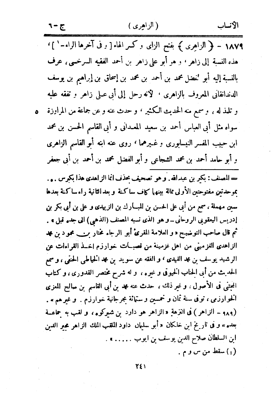بفتح الزاى وكسر الهاء [وفي آخرها الراء-[1]] ، هذه النسبة إلى زاهر، وهو أبو على زاهر بن أحمد الفقيه السرخسي، عرف بالنسبة إليه أبو الفضل محمد بن أحمد بن محمد بن إسحاق بن إبراهيم بن يوسف الدندانقانى المعروف بالزاهرى، لأنه رحل إلى أبى على زاهر وتفقه عليه وتلمذ له، وسمع منه الحديث الكثير، وحدث عنه وعن جماعة من المراوزة سواه مثل أبى العباس أحمد بن سعيد المعداني وأبى القاسم الحسن بن محمد ابن حبيب المفسر النيسابورىّ وغيرهما، روى عنه ابنه أبو القاسم الزاهريّ وأبو حامد أحمد بن محمد الشجاعي وأبو الفضل محمد بن أحمد بن أبى جعفر