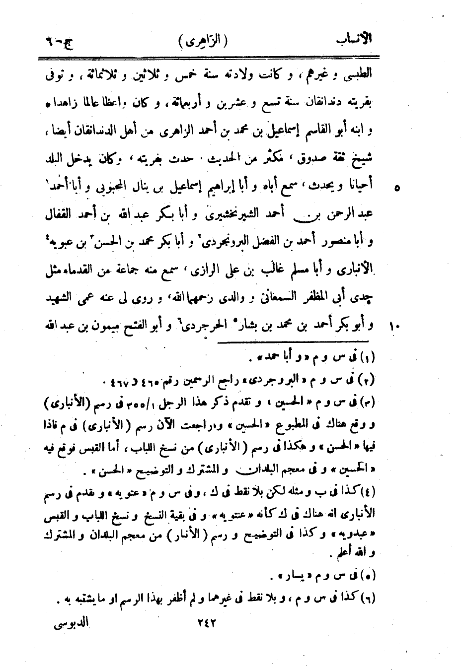 الطبسي وغيرهم، وكانت ولادته سنة خمس وثلاثين وثلاثمائة، وتوفى بقريته دندانقان سنة تسع وعشرين وأربعمائة، وكان واعظا عالما زاهدا وابنه أبو القاسم إسماعيل بن محمد بن أحمد الزاهريّ من أهل الدندانقان أيضا، شيخ ثقة صدوق، مكثر من الحديث، حدث بقريته، وكان يدخل البلد أحيانا ويحدث، سمع أباه وأبا إبراهيم إسماعيل بن ينال المحبوبي وأبا أحمد [1] عبد الرحمن بن أحمد الشيرنخشيرى وأبا بكر عبد الله بن أحمد القفال وأبا منصور أحمد بن الفضل البرونجردى [2] وأبا بكر محمد بن الحسن [3] بن عبويه [4] الأنباري وأبا مسلم غالب بن على الرازيّ، سمع منه جماعة من القدماء مثل جدي أبى المظفر السمعاني ووالدي رحمهما الله، وروى لي عنه عمى الشهيد وأبو بكر أحمد بن محمد بن بشار [5] الحرجردى [6] وأبو الفتح ميمون بن عبد الله