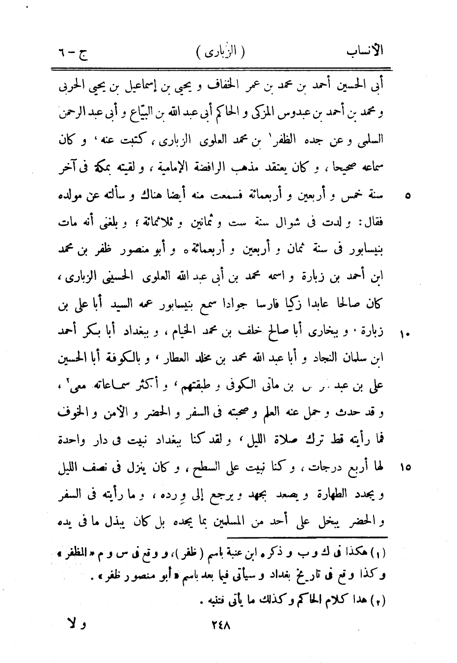 أبى الحسين أحمد بن محمد بن عمر الخفاف ويحيى بن إسماعيل بن يحيى الحربي ومحمد بن أحمد بن عبدوس المزكي والحاكم أبى عبد الله بن البيّاع وأبى عبد الرحمن السلمي وعن جده الظفر [1] بن محمد العلويّ الزبارى، كتبت عنه، وكان سماعه صحيحا، وكان يعتقد مذهب الرافضة الإمامية، ولقيته بمكة في آخر سنة خمس وأربعين وأربعمائة فسمعت منه أيضا هناك وسألته عن مولده فقال: ولدت في شوال سنة ست وثمانين وثلاثمائة، وبلغني أنه مات بنيسابور في سنة ثمان وأربعين وأربعمائة وأبو منصور ظفر بن محمد ابن أحمد بن زبارة واسمه محمد بن أبى عبد الله العلويّ الحسيني الزبارى، كان صالحا عابدا زكيا فارسا جوادا سمع بنيسابور عمه السيد أبا على بن زبارة، وببخارى أبا صالح خلف بن محمد الخيام، وببغداد أبا بكر أحمد ابن سلمان النجاد وأبا عبد الله محمد بن مخلد العطار، وبالكوفة أبا الحسين على بن عبد الرحمن بن ماتى الكوفي وطبقتهم، وأكثر سماعاته معى [2] ، وقد حدث وحمل عنه العلم وصحبته في السفر والحضر والأمن والخوف فما رأيته قط ترك صلاة الليل، ولقد كنا ببغداد نبيت في دار واحدة لها أربع درجات، وكنا نبيت على السطح، وكان ينزل في نصف الليل ويجدد الطهارة ويصعد بجهد ويرجع إلى ورده، وما رأيته في السفر والحضر يبخل على أحد من المسلمين بما يجده بل كان يبذل ما في يده