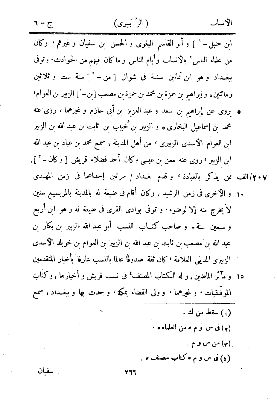 ابن حنبل-[1]] وأبو القاسم البغوي والحسن بن سفيان وغيرهم، وكان من علماء الناس [2] بالأنساب وأيام الناس وما كان فيهم من الحوادث، وتوفى ببغداد وهو ابن ثمانين سنة في شوال [من-[3]] سنة ست وثلاثين ومائتين وإبراهيم بن حمزة بن محمد بن حمزة بن مصعب [بن-[1]] الزبير بن العوام، يروى عن إبراهيم بن سعد وعبد العزيز بن أبى حازم وغيرهما، روى عنه محمد بن إسماعيل البخاري والزبير بن خبيب بن ثابت بن عبد الله بن الزبير ابن العوام الأسدي الزبيري، من أهل المدينة، سمع محمد بن عباد بن عبد الله ابن الزبير، روى عنه معن بن عيسى وكان أحد فضلاء قريش [وكان-[3]] ممن يذكر بالعبادة، وقدم بغداد/ مرتين إحداهما في زمن المهدي والأخرى في زمن الرشيد، وكان أقام في ضيعة له بالمدينة بالمريسيع سنين لا يخرج منه إلا لوضوء، وتوفى بوادي القرى في ضيعة له وهو ابن أربع وسبعين سنة وصاحب كتاب النسب أبو عبد الله الزبير بن بكار بن عبد الله بن مصعب بن ثابت بن عبد الله بن الزبير بن العوام بن خويلد الأسدي الزبيري المديني العلامة، كان ثقة صدوقا عالما بالنسب عارفا بأخبار المتقدمين ومآثر الماضين، وله الكتاب المصنف [4] في نسب قريش وأخبارها، وكتاب الموفّقيات، وغيرهما، وولى القضاء بمكة، وحدث بها وببغداد، سمع