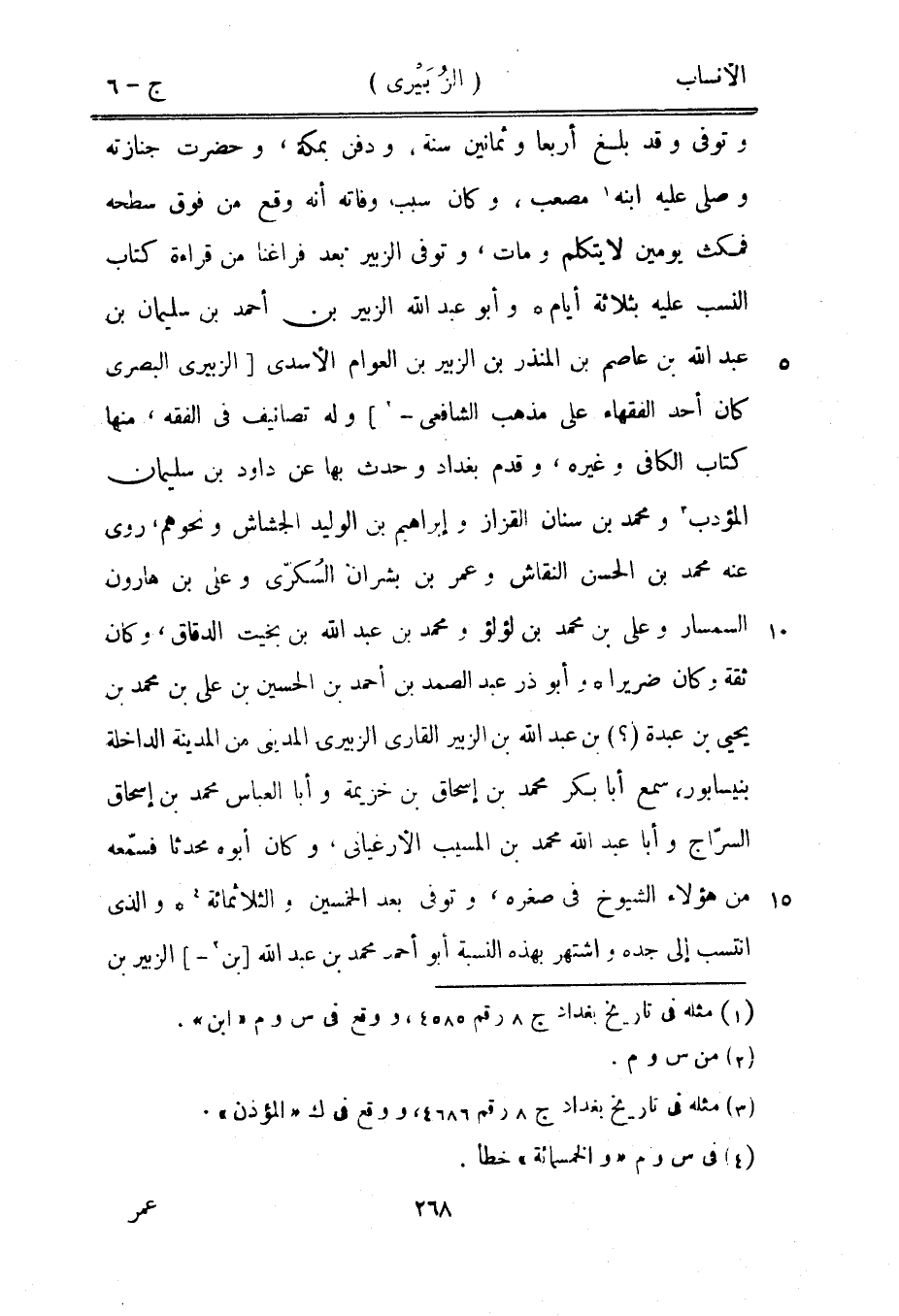 وتوفى وقد بلغ أربعا وثمانين سنة، ودفن بمكة، وحضرت جنازته وصلى عليه ابنه [1] مصعب، وكان سبب وفاته أنه وقع من فوق سطحه فمكث يومين لا يتكلم ومات، وتوفى الزبير بعد فراغنا من قراءة كتاب النسب عليه بثلاثة أيام وأبو عبد الله الزبير بن أحمد بن سليمان بن عبد الله بن عاصم بن المنذر بن الزبير بن العوام الأسدي [الزبيري البصري كان أحد الفقهاء على مذهب الشافعيّ-[2]] وله تصانيف في الفقه، منها كتاب الكافي وغيره، وقدم بغداد وحدث بها عن داود بن سليمان المؤدب [3] ومحمد بن سنان القزاز وإبراهيم بن الوليد الجشاش ونحوهم، روى عنه محمد بن الحسن النقاش وعمر بن بشران السكّرى وعلى بن هارون السمسار وعلى بن محمد بن لؤلؤ ومحمد بن عبد الله بن بخيت الدقاق، وكان ثقة وكان ضريرا وأبو ذر عبد الصمد بن أحمد بن الحسين بن على بن محمد بن يحيى بن عبدة (؟) بن عبد الله بن الزبير القاري الزبيري المديني من المدينة الداخلة بنيسابور، سمع أبا بكر محمد بن إسحاق بن خزيمة وأبا العباس محمد بن إسحاق السرّاج وأبا عبد الله محمد بن المسيب الأرغياني، وكان أبوه محدثا فسمّعه من هؤلاء الشيوخ في صغره، وتوفى بعد الخمسين والثلاثمائة [4] والّذي انتسب إلى جده واشتهر بهذه النسبة أبو أحمد محمد بن عبد الله [بن [2]-] الزبير بن