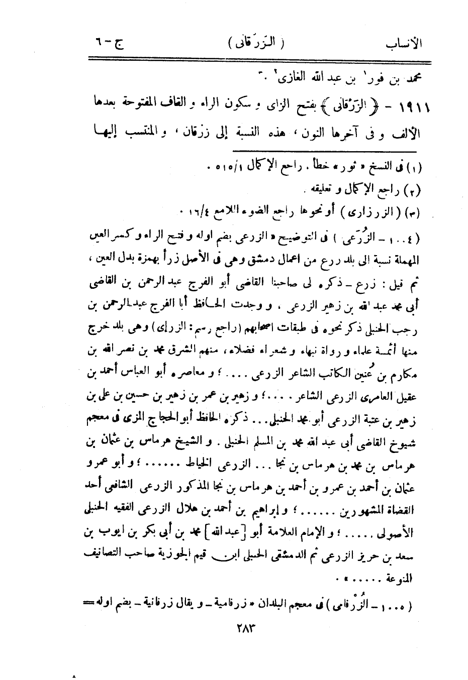 (1004- الزرعى) في التوضيح «الزرعى بضم اوله وفتح الراء وكسر العين المهملة نسبة الى بلد زرع من اعمال دمشق وهي في الأصل زرأ بهمزة بدل العين، ثم قيل: زرع- ذكره لي صاحبنا القاضي أبو الفرج عبد الرحمن بن القاضي أبى محمد عبد الله بن زهير الزرعى، ووجدت الحافظ أبا الفرج عبد الرحمن بن رجب الحنبلي ذكر نحوه في طبقات أصحابهم (راجع رسم: الزرإى) وهي بلد خرج منها أئمة علماء ورواة نبهاء وشعراء فضلاء، منهم الشرق محمد بن نصر الله بن مكارم بن عنين الكاتب الشاعر الزرعى....، ومعاصره أبو العباس أحمد بن عقيل العامري الزرعى الشاعر....، وزهير بن عمر بن زهير بن حسين بن على بن زهير بن عتبة الزرعى أبو محمد الحنبلي.... ذكره الحافظ أبو الحجاج المزي في معجم شيوخ القاضي أبى عبد الله محمد بن المسلم الحنبلي. والشيخ هرماس بن عثمان بن هرماس بن محمد بن هرماس بن نجا ... الزرعى الخياط....، وأبو عمرو عثمان بن أحمد بن عمرو بن أحمد بن هرماس بن نجا المذكور الزرعى الشافعيّ أحد القضاة المشهورين....، وإبراهيم بن أحمد بن هلال الزرعى الفقيه الحنبلي الأصولي.....، والإمام العلامة أبو [عبد الله] محمد بن أبى بكر بن أيوب بن سعد بن حريز الزرعى ثم الدمشقيّ الحنبلي ابن قيم الجوزية صاحب التصانيف المنوعة.....» .