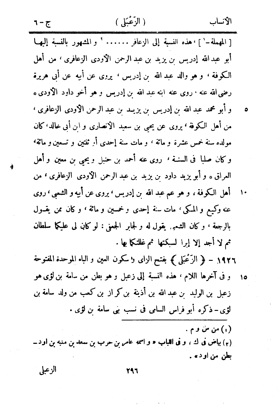 [المهملة-[1]] ، هذه النسبة إلى الزعافر...... [2] والمشهور بالنسبة إليها أبو عبد الله إدريس بن يزيد بن عبد الرحمن الأودي الزعافرى، من أهل الكوفة، وهو والد عبد الله بن إدريس، يروى عن أبيه عن أبى هريرة رضي الله عنه، روى عنه ابنه عبد الله بن إدريس وهو أخو داود الأودي وأبو محمد عبد الله بن إدريس بن يزيد بن عبد الرحمن الأودي الزعافرى، من أهل الكوفة، يروى عن يحيى بن سعيد الأنصاري وابن أبى خالد، كان مولده سنة خمس عشرة ومائة، ومات سنة إحدى أو ثنتين وتسعين ومائة، وكان صلبا في السنة، روى عنه أحمد بن حنبل ويحيى بن معين وأهل العراق وأبو يزيد داود بن يزيد بن عبد الرحمن الأودي الزعافرى، من أهل الكوفة، وهو عم عبد الله بن إدريس، يروى عن أبيه والشعبي، روى عنه وكيع والمكيّ، مات سنة إحدى وخمسين ومائة، وكان ممن يقول بالرجعة، وكان الشعبي يقول له ولجابر الجعفي: لو كان لي عليكما سلطان ثم لا أجد إلا إبرا لسبكتها ثم غللتكما بها.
