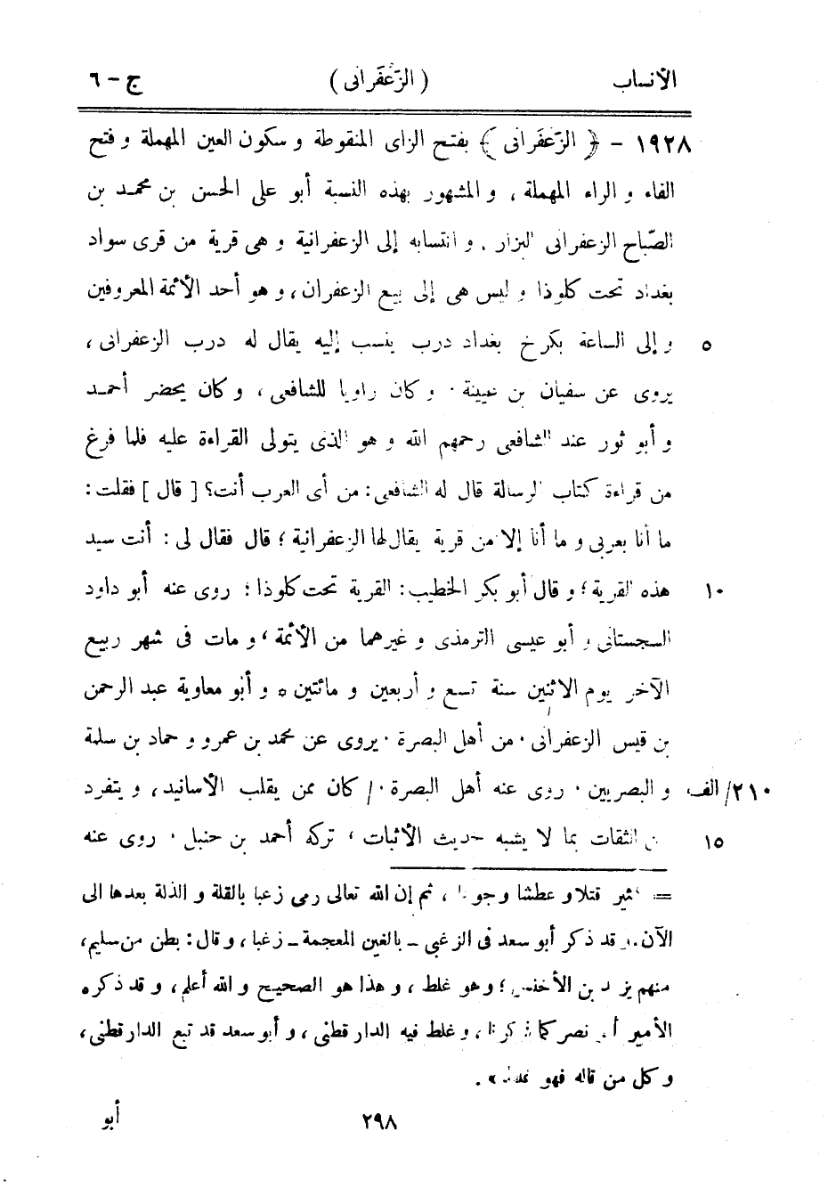 ما أنا بعربي وما أنا إلا من قرية يقال لها الزعفرانية، قال فقال لي: أنت سيد هذه القرية، وقال أبو بكر الخطيب: القرية تحت كلوذا، روى عنه أبو داود السجستاني وأبو عيسى الترمذي وغيرهما من الأئمة، ومات في شهر ربيع الآخر يوم الاثنين سنة تسع وأربعين ومائتين وأبو معاوية عبد الرحمن بن قيس الزعفرانيّ، من أهل البصرة، يروى عن محمد بن عمرو وحماد بن سلمة والبصريين، روى عنه أهل البصرة/ كان ممن يقلب الأسانيد، ويتفرد من الثقات بما لا يشبه حديث الأثبات، تركه أحمد بن حنبل، روى عنه