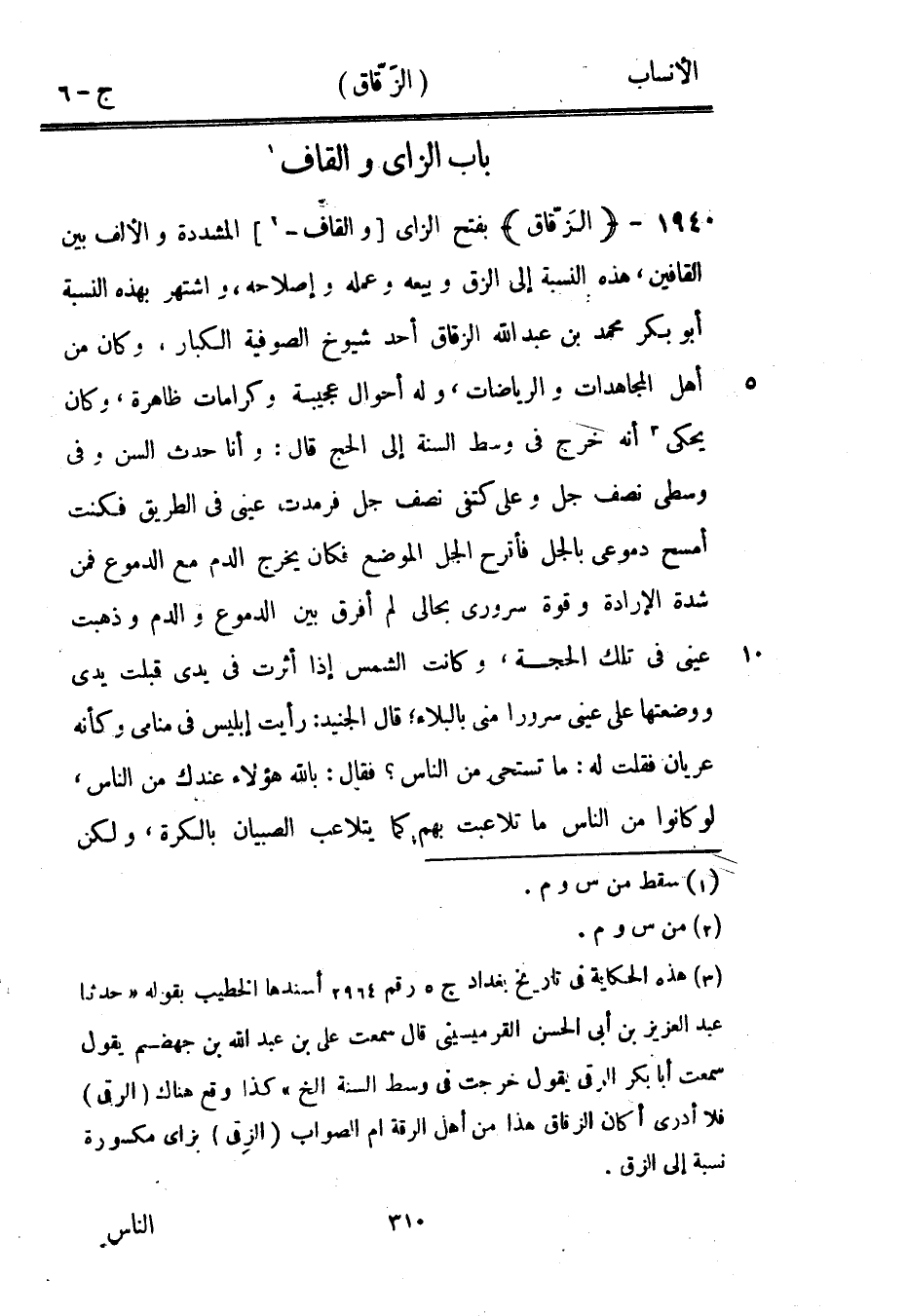 [3] هذه الحكاية في تاريخ بغداد ج 5 رقم 2964 أسندها الخطيب بقوله «حدثنا عبد العزيز بن أبى الحسن القرميسيني قال سمعت على بن عبد الله بن جهضم يقول سمعت أبا بكر الرقى يقول خرجت في وسط السنخ إلخ» كذا وقع هناك (الرقى) فلا أدرى أكان الزقاق هذا من أهل الرقة أم الصواب (الزِّقي) بزاى مكسورة نسبة إلى الزق.