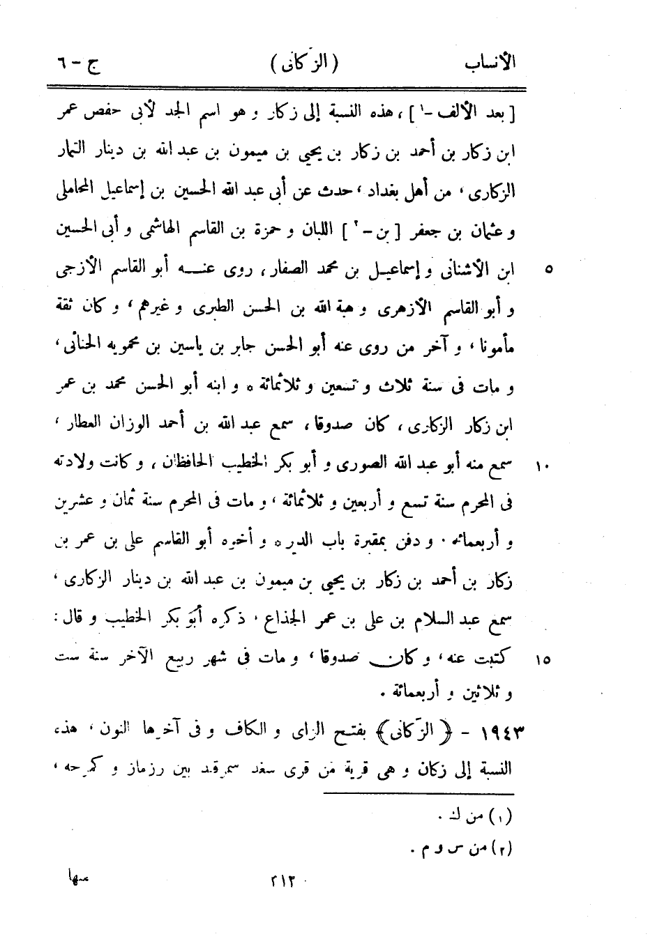 [بعد الألف-[1]] ، هذه النسبة إلى زكار وهو اسم الجد لأبى حفص عمر ابن زكار بن أحمد بن زكار بن يحيى بن ميمون بن عبد الله بن دينار التمار الزكارى، من أهل بغداد، حدث عن أبى عبد الله الحسين بن إسماعيل المحاملي وعثمان بن جعفر [بن-[2]] اللبان وحمزة بن القاسم الهاشمي وأبى الحسين ابن الأشناني وإسماعيل بن محمد الصفار، روى عنه أبو القاسم الأزجي وأبو القاسم الأزهري وهبة الله بن الحسن الطبري وغيرهم، وكان ثقة مأمونا، وآخر من روى عنه أبو الحسن جابر بن ياسين بن محمويه الحنائى، ومات في سنة ثلاث وتسعين وثلاثمائة وابنه أبو الحسن محمد بن عمر ابن زكار الزكارى، كان صدوقا، سمع عبد الله بن أحمد الوزان العطار، سمع منه أبو عبد الله الصوري وأبو بكر الخطيب الحافظان، وكانت ولادته في المحرم سنة تسع وأربعين وثلاثمائة، ومات في المحرم سنة ثمان وعشرين وأربعمائة، ودفن بمقبرة باب الدير وأخوه أبو القاسم على بن عمر بن زكار بن أحمد بن زكار بن يحيى بن ميمون بن عبد الله بن دينار الزكارى، سمع عبد السلام بن على بن عمر الجذاع، ذكره أبو بكر الخطيب وقال: