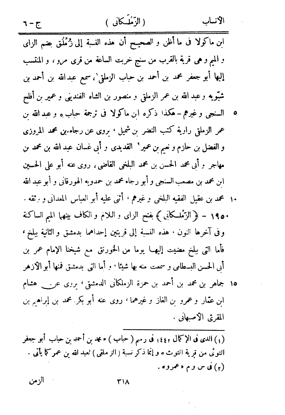 ابن ماكولا في ما أظن والصحيح أن هذه النسبة إلى زملق بضم الزاى والميم وهي قرية بالقرب من سنج خربت الساعة من قرى مرو، والمنتسب إليها أبو جعفر محمد بن أحمد بن حباب الزملقى [1] ، سمع عبد الله بن أحمد بن شبّويه وعبد الله بن عمر الزملقى ومنصور بن الشاه الفندينى وعمير بن أفلح السنجى وغيرهم- هكذا ذكره ابن ماكولا في ترجمة حباب وعبد الله بن عمر الزملقى راوية كتب النضر بن شميل، يروى عن رجاء بن محمد المروزي والفضل بن حازم ونعيم بن عمير [2] القديدي وأبى غسان عبد الله بن محمد بن مهاجر وأبى محمد الحسن بن محمد البلخي القاضي، روى عنه أبو على الحسين ابن محمد بن مصعب السنجى وأبو رجاء محمد بن حمدويه الهورقانى وأبو عبد الله محمد بن عقيل الفقيه البلخي وغيرهم، أثنى عليه أبو العباس المعداني ووثقه.